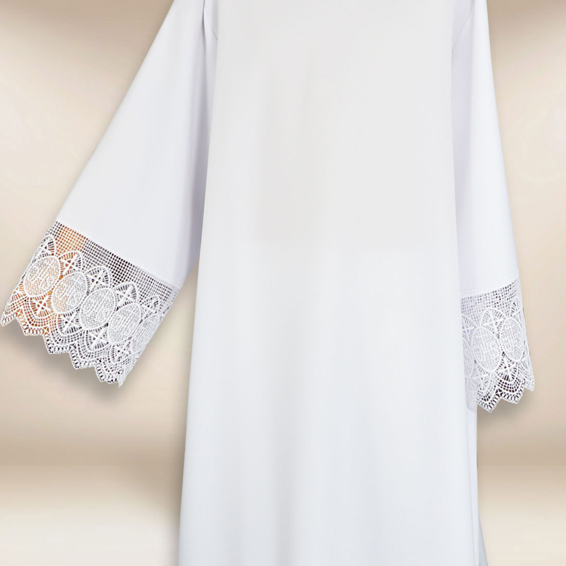 Alba z gipiurą IHS 194cm stanowi wyraz harmonijnego połączenia tradycji Kościoła z dbałością o detal i estetykę właściwą celebracji liturgicznej. Jej forma została opracowana z myślą o kapłanach i osobach posługujących, którzy oczekują szaty godnej, uporządkowanej i wpisującej się w rytm roku liturgicznego. Biała barwa alby, od wieków symbolizująca czystość, światło i nowe życie w Chrystusie, sprawia, że może być ona używana podczas większości celebracji – zarówno w dni powszednie, jak i w czasie uroczystości.