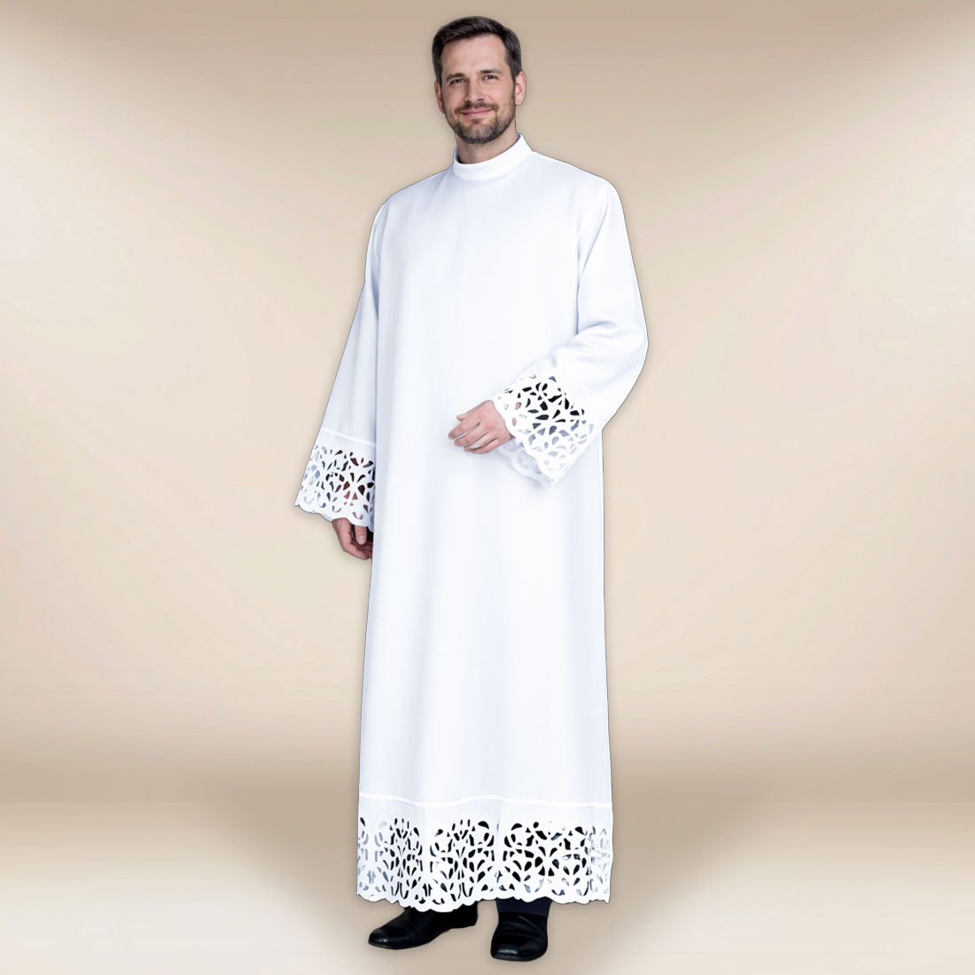 Istotnym elementem kompozycji jest starannie opracowana gipiura, umieszczona na rękawach oraz w dolnym wykończeniu alby. Jej wzór został dobrany tak, aby podkreślać charakter szaty, nie zaburzając jej prostoty. Subtelne zdobienie wprowadza akcent elegancji, pozostając w pełnej zgodzie z powagą liturgii. Całość tworzy spójną kompozycję, w której każdy detal ma swoje uzasadnienie – zarówno estetyczne, jak i funkcjonalne.