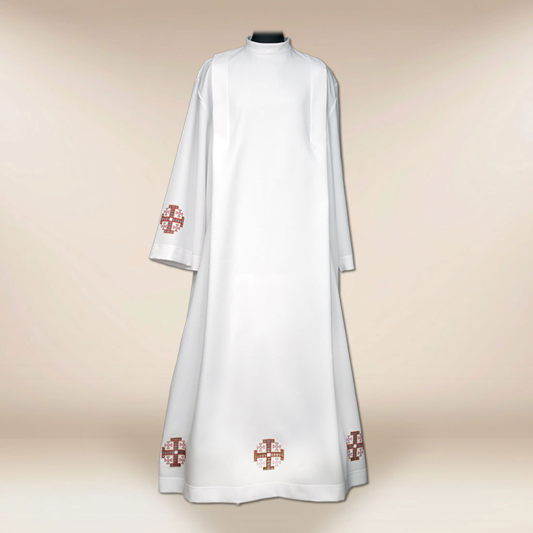 Alba haftowana Krzyże Jerozolimskie czerwone 188cm ta doskonale sprawdzi się podczas uroczystych Mszy Świętych, celebracji sakramentów oraz ważnych wydarzeń roku liturgicznego. Jej ponadczasowy charakter sprawia, że pozostaje odpowiednim wyborem niezależnie od okoliczności, tworząc spójną całość z innymi elementami stroju liturgicznego.