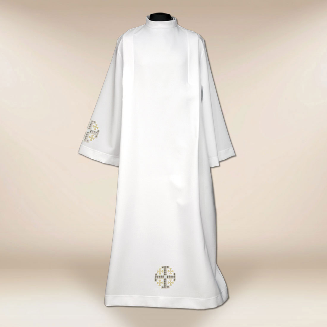 Alba haftowana Krzyże Jerozolimskie złote 188cm ta doskonale sprawdzi się podczas uroczystych Mszy Świętych, celebracji sakramentów oraz ważnych wydarzeń roku liturgicznego. Jej ponadczasowy charakter sprawia, że pozostaje odpowiednim wyborem niezależnie od okoliczności, tworząc spójną całość z innymi elementami stroju liturgicznego.