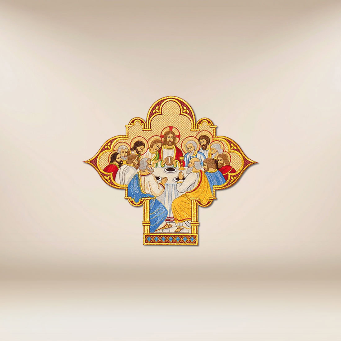 Elegancka aplikacja haftowana z motywem Ostatniej Wieczerzy, wykonana z najwyższej jakości nici, przeznaczona do szat i tekstyliów liturgicznych.