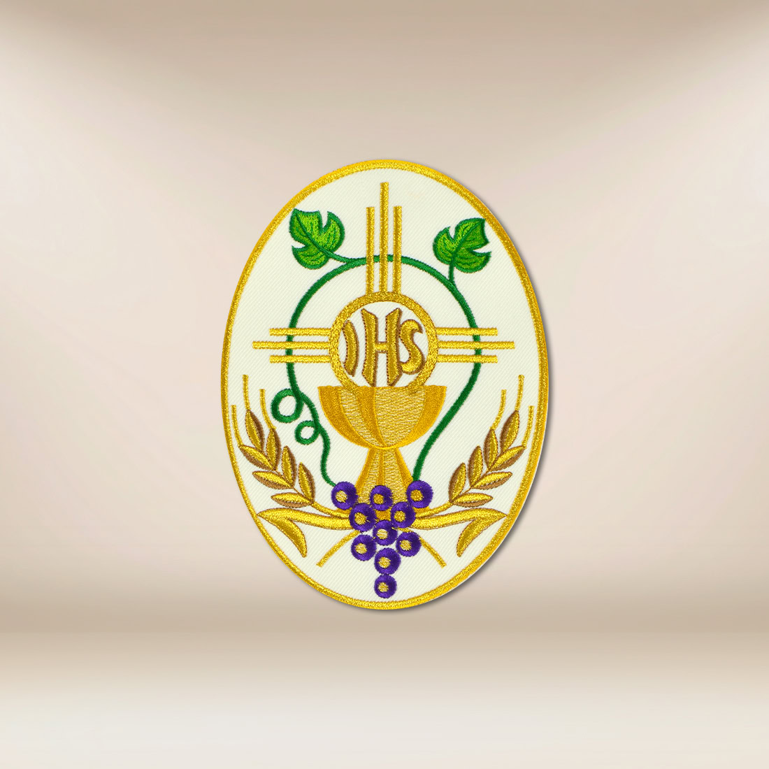 Aplikacja haftowana IHS eucharystyczna została zaprojektowana z myślą o subtelnym, a jednocześnie wyrazistym podkreśleniu tajemnicy Eucharystii. Już pierwsze spojrzenie na aplikację haftowaną „IHS” odsłania spójną kompozycję: kielich, hostię z monogramem IHS, oplatające całość pędy winorośli, kłosy zboża oraz grona winne.