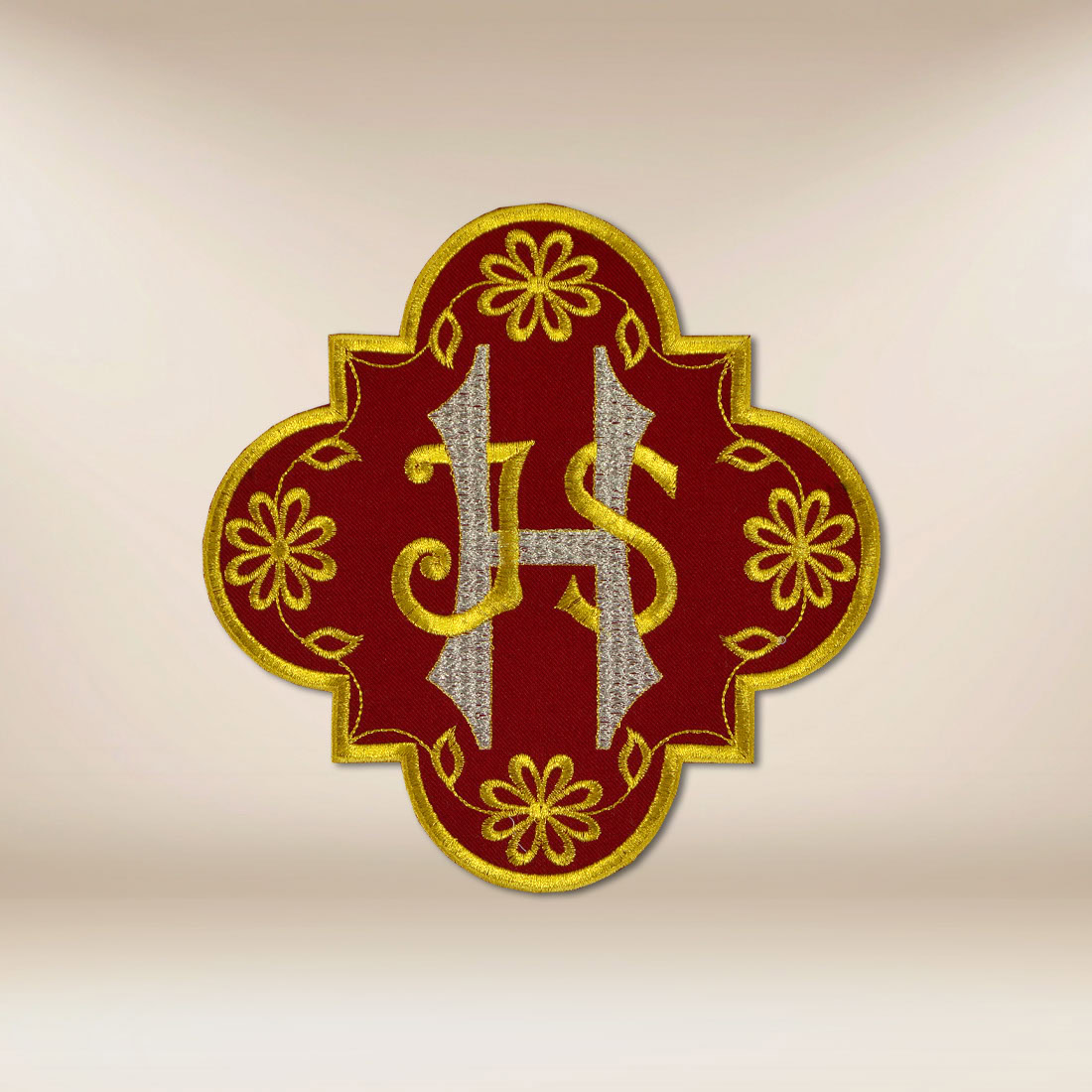Aplikacja haftowana IHS przedstawia jeden z najbardziej rozpoznawalnych i teologicznie bogatych symboli chrześcijaństwa – monogram imienia Jezusa Chrystusa. Skrót IHS, wywodzący się z greckiego zapisu imienia Zbawiciela, od stuleci jest znakiem czci, adoracji i wiary w realną obecność Chrystusa w Eucharystii. Kompozycja aplikacji została zaprojektowana w sposób harmonijny i czytelny, tak aby symbol pozostawał wyraźny nawet z większej odległości.