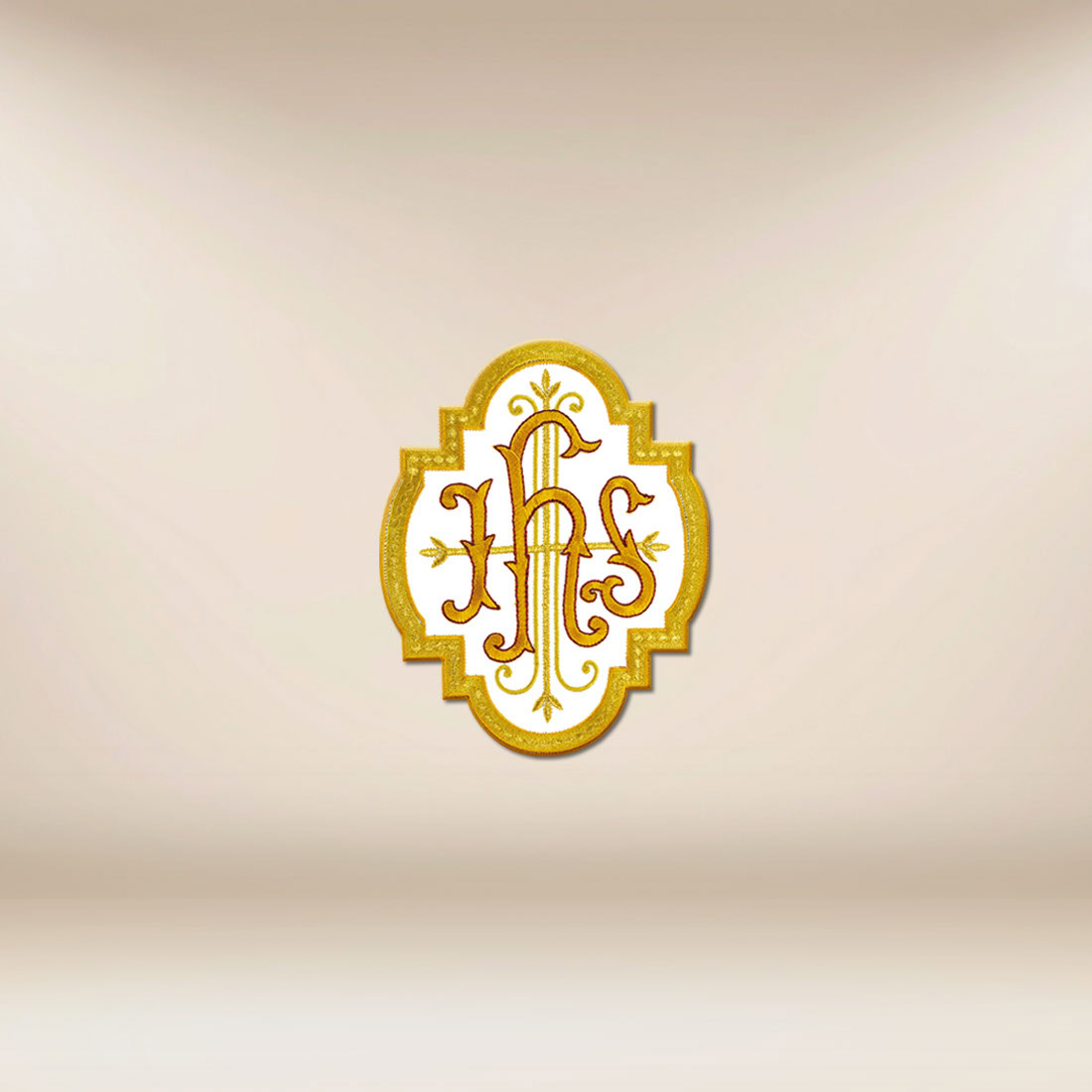 Monogram IHS odwołuje się do imienia Chrystusa i stanowi jeden z najbardziej rozpoznawalnych znaków eucharystycznych. Dzięki temu aplikacja staje się nie tylko ozdobą, lecz także czytelnym znakiem wiary — doskonałym do wykorzystania podczas Mszy Świętej, adoracji oraz uroczystości parafialnych.