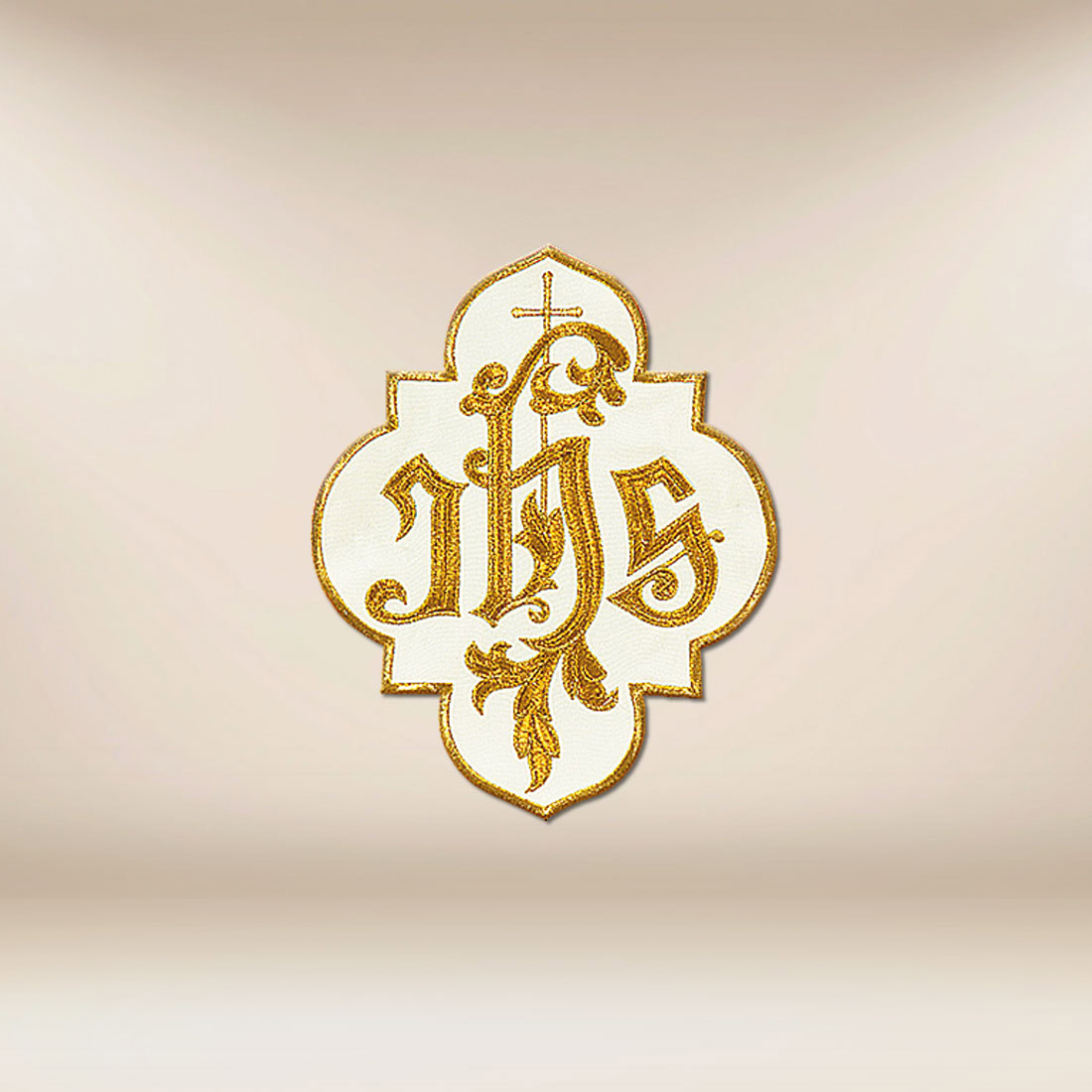 Symbolika IHS z krzyżem wskazuje na tajemnicę Męki, Śmierci i Zmartwychwstania Chrystusa, a jednocześnie na Jego realną obecność w Eucharystii. Starannie opracowany haft, eleganckie kontury liter oraz subtelne zdobienia nadają aplikacji wyważony, liturgiczny charakter. Kompozycja jest dostojna i klarowna, dzięki czemu znak pozostaje czytelny zarówno z bliska, jak i z większej odległości.