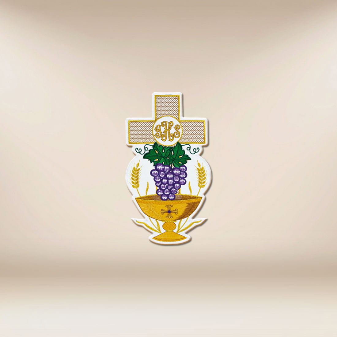 Aplikacja haftowana Komunia to misternie wykonany detal, stworzony z myślą o podkreśleniu piękna celebracji i bogactwa znaków eucharystycznych. Już pierwsze spojrzenie na aplikację haftowaną Komunia odsłania spójną kompozycję: kielich, grona winne, kłosy pszenicy oraz monogram IHS wpisany w kształt krzyża. Każdy element niesie głęboką wymowę — odwołuje do darów ołtarza, ofiary i obecności Chrystusa.