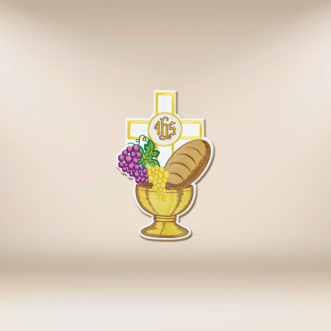 Aplikacja haftowana komunia została zaprojektowana jako wyjątkowy akcent nawiązujący do tajemnicy Eucharystii. Połączenie krzyża z monogramem IHS, chleba, winogron i kielicha przypomina o darze obecności Chrystusa i o duchowym wymiarze celebracji. Aplikacja haftowana komunia sprawdzi się na ornatów, stułach, chorągwiach, obrusach oraz tekstyliach przygotowywanych na uroczystości pierwszokomunijne i eucharystyczne.