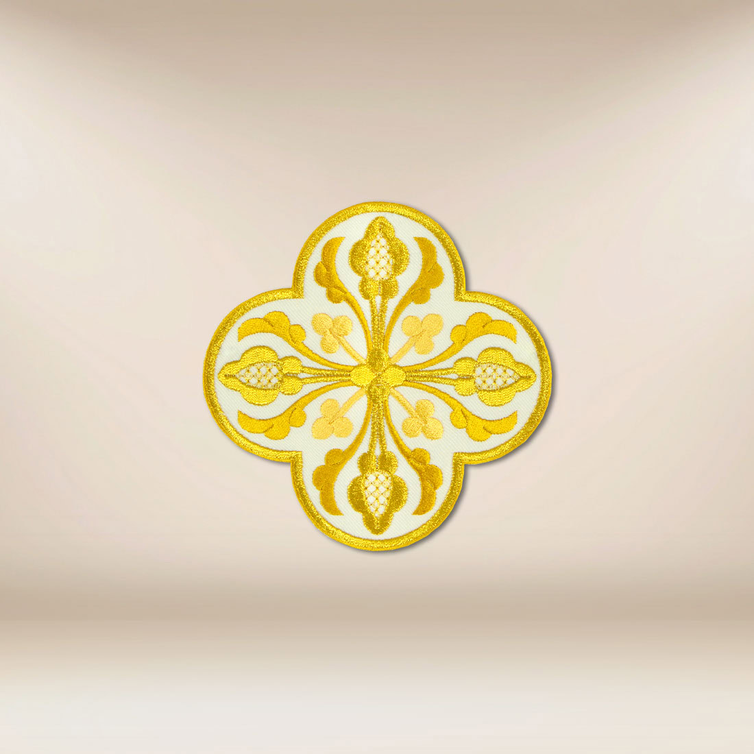 Do wykonania zastosowano wysokiej jakości nici hafciarskie, które zapewniają trwałość, wyrazistość wzoru oraz eleganckie wykończenie. Precyzja wykonania sprawia, że każdy detal pozostaje czytelny i estetyczny nawet przy intensywnym użytkowaniu. Rozmiar 13 × 13 cm czyni aplikację uniwersalną i łatwą do dopasowania do różnych elementów szat liturgicznych.