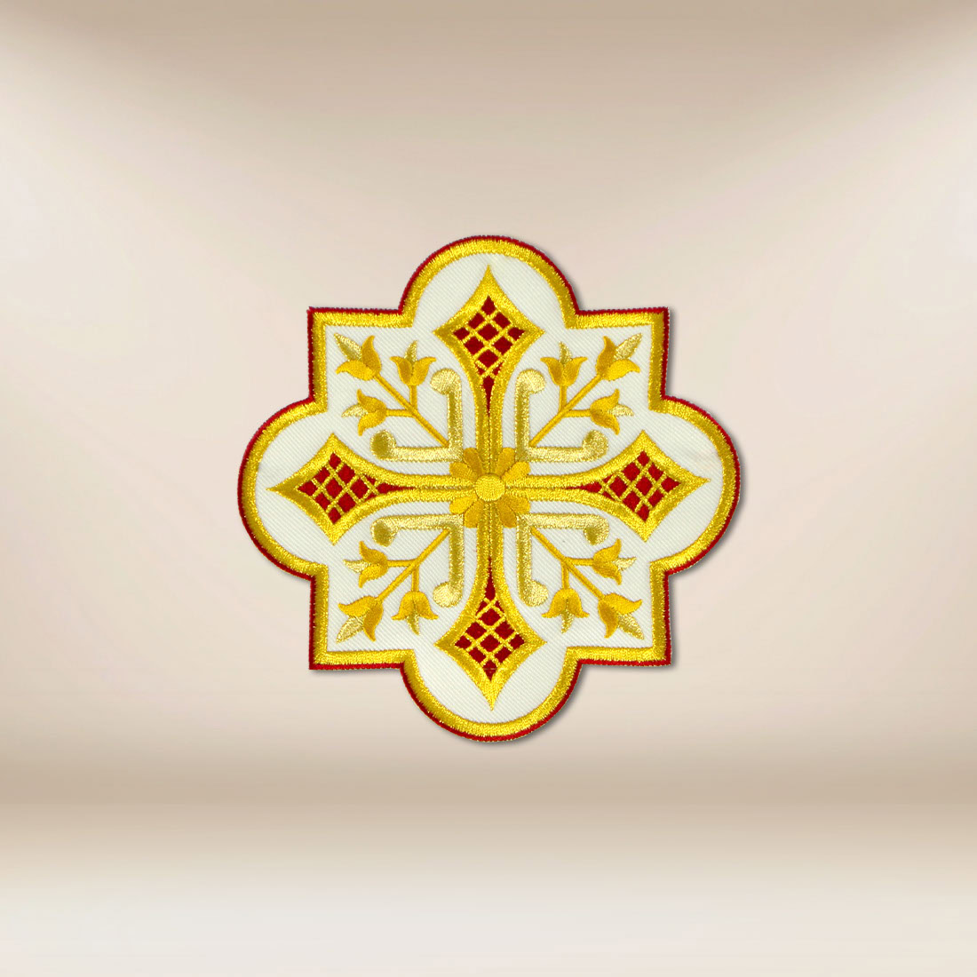 Do wykonania produktu wykorzystano wysokiej jakości nici hafciarskie, które zapewniają trwałość, wyrazistość wzoru oraz eleganckie wykończenie. Precyzja wykonania sprawia, że każdy detal pozostaje czytelny i estetyczny nawet przy intensywnym użytkowaniu. Rozmiar 17 × 17 cm czyni aplikację uniwersalną i łatwą do dopasowania do różnych elementów szat.