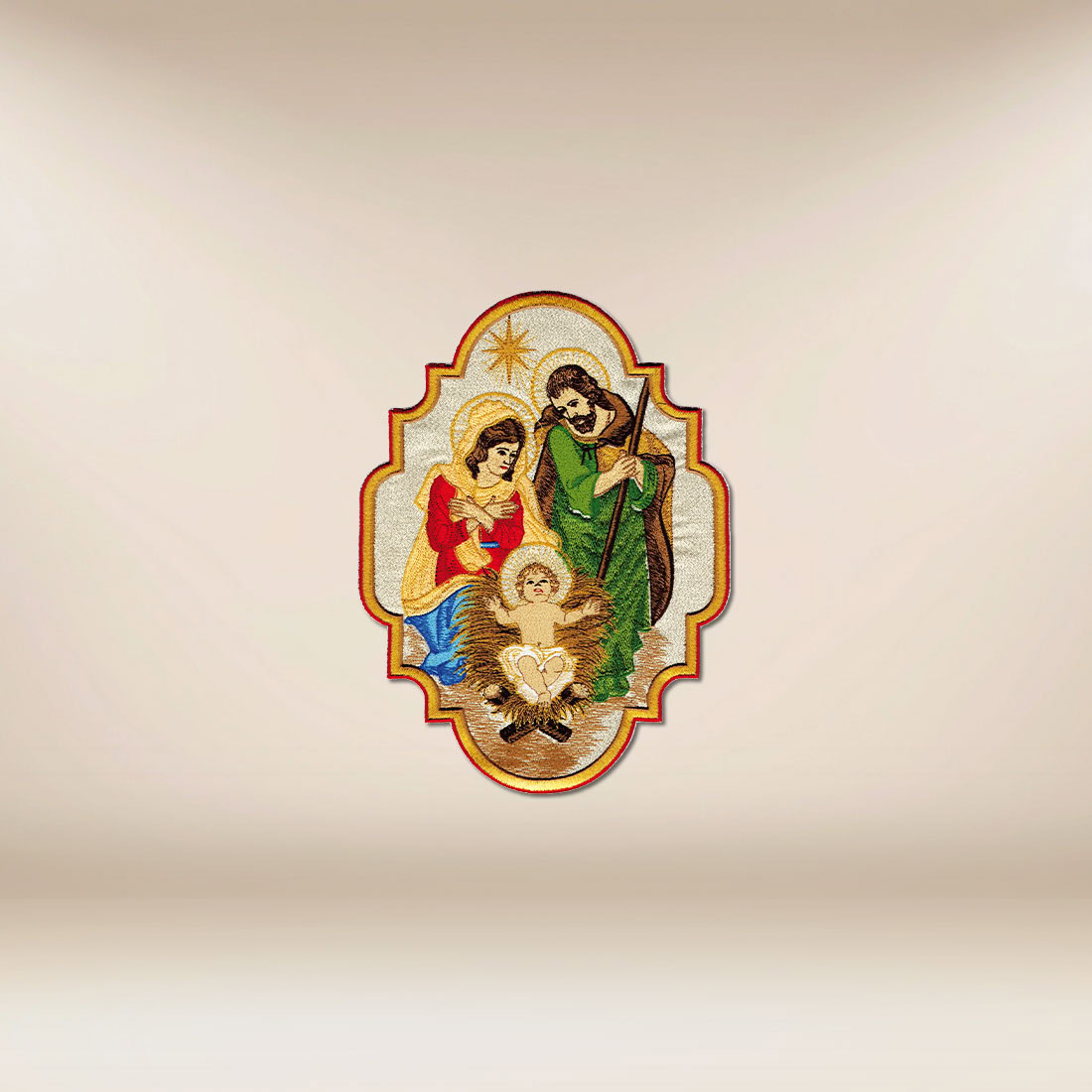 Precyzyjny haft zapewnia trwałość, wyrazistość i wysoką estetykę, a starannie dobrane odcienie tworzą wrażenie głębi i miękkości. Motyw pięknie prezentuje się na tekstyliach przeznaczonych na okres Bożego Narodzenia oraz uroczystości rodzinne w parafii.