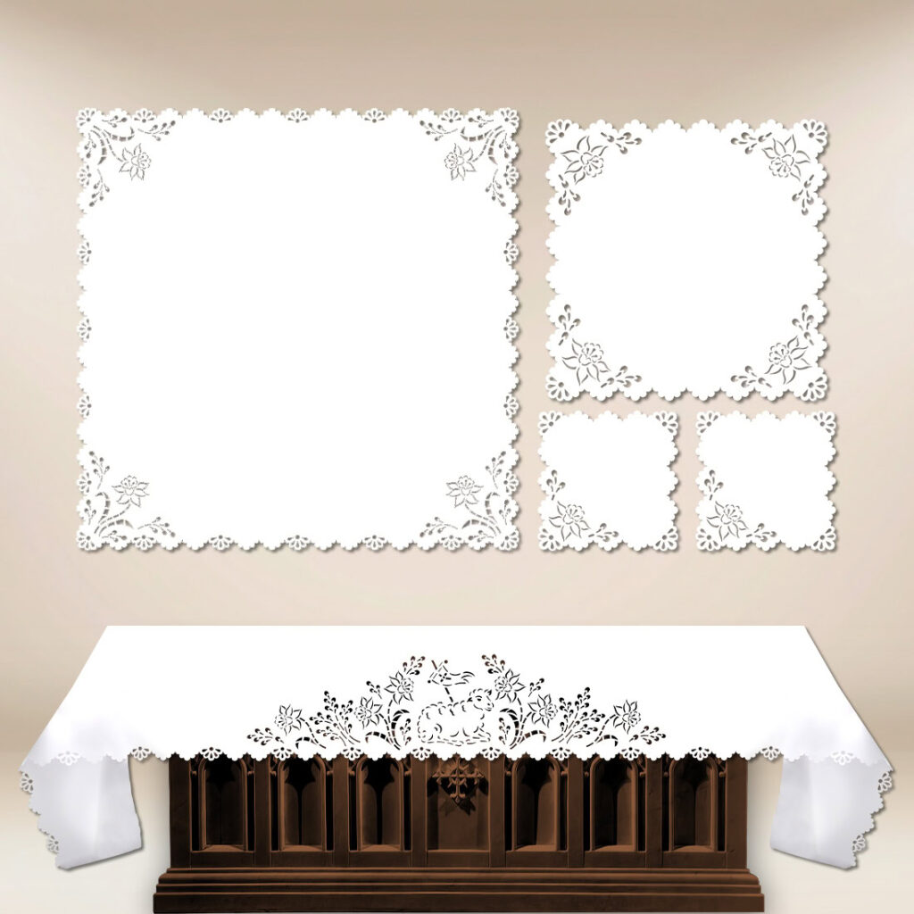 W skład kompletu wchodzą: serweta 95×95 cm, serwetka 45×45 cm, dwie serwetki 26×26 cm oraz obrus ołtarzowy wykonywany na dowolny wymiar (do 5 m długości). Dzięki temu zestaw można dopasować do różnych rodzajów ołtarzy, tworząc spójną i elegancką oprawę prezbiterium.