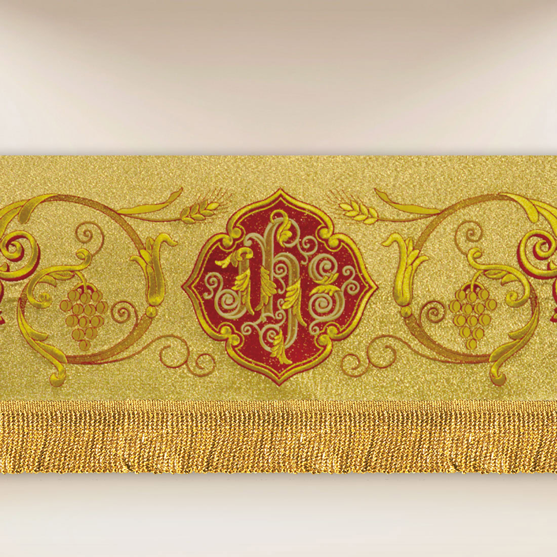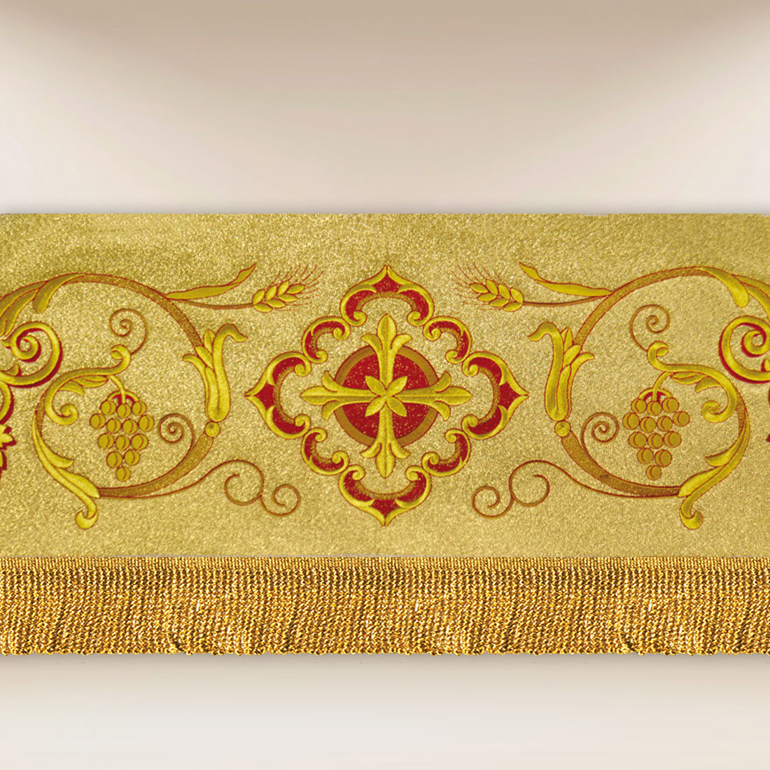 Baldachim procesyjny haftowany został przygotowany z myślą o uroczystej oprawie liturgii eucharystycznych, zwłaszcza o procesjach Bożego Ciała. Starannie dobrana tkanina, o brokatowym splocie, nadaje mu niezwykle elegancki charakter. Baldachim jest solidny, estetycznie dopracowany i odpowiedni do użytkowania zarówno w przestrzeniach kościelnych, jak i podczas procesji na świeżym powietrzu.