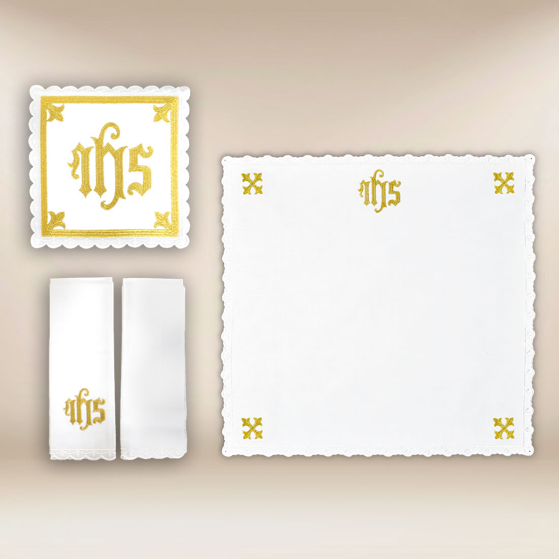 Motywem przewodnim zestawu jest chrystogram IHS, od wieków obecny w tradycji Kościoła jako znak imienia Jezus i Jego realnej obecności w Eucharystii. Umieszczony w dekoracyjnej, geometrycznej ramie, nawiązuje do architektonicznego ładu i majestatu katedr, wprowadzając do liturgii atmosferę powagi, skupienia i duchowej głębi. Subtelne detale haftu dopełniają kompozycję, zachowując równowagę pomiędzy ozdobnością a liturgicznym umiarem.