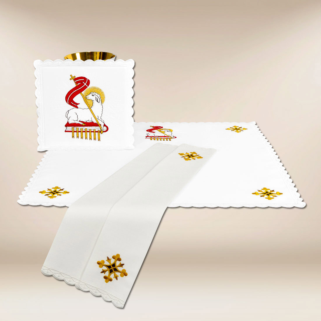 Starannie rozmieszczone haftowane detale sprawiają, że bielizna kielichowa Agnus Dei tworzy spójną całość z pozostałymi elementami kompletu Agnus Dei, zachowując harmonię formy i symboliki. Subtelna ornamentyka nie dominuje przestrzeni ołtarza, lecz ją porządkuje i podkreśla jej sakralny charakter.