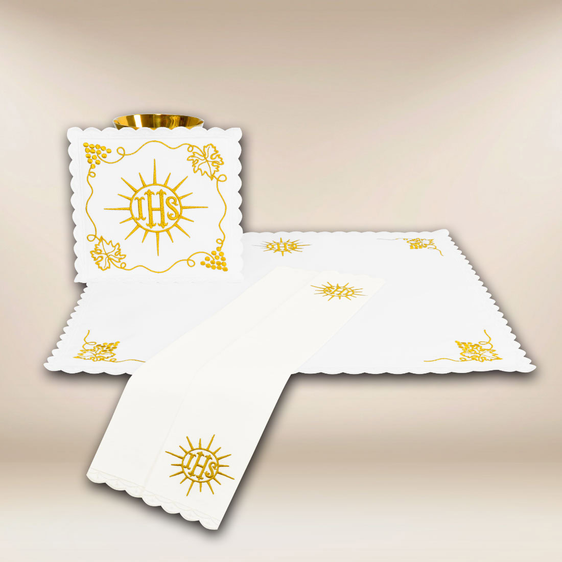 Bielizna kielichowa Cristiano została zaprojektowana jako czytelna i elegancka oprawa Eucharystii, łącząca klasyczną symbolikę z dopracowaną formą zdobniczą. Jasna kolorystyka oraz promienisty motyw centralny sprawiają, że komplet doskonale prezentuje się na ołtarzu i sprzyja skupieniu podczas sprawowania Mszy Świętej.