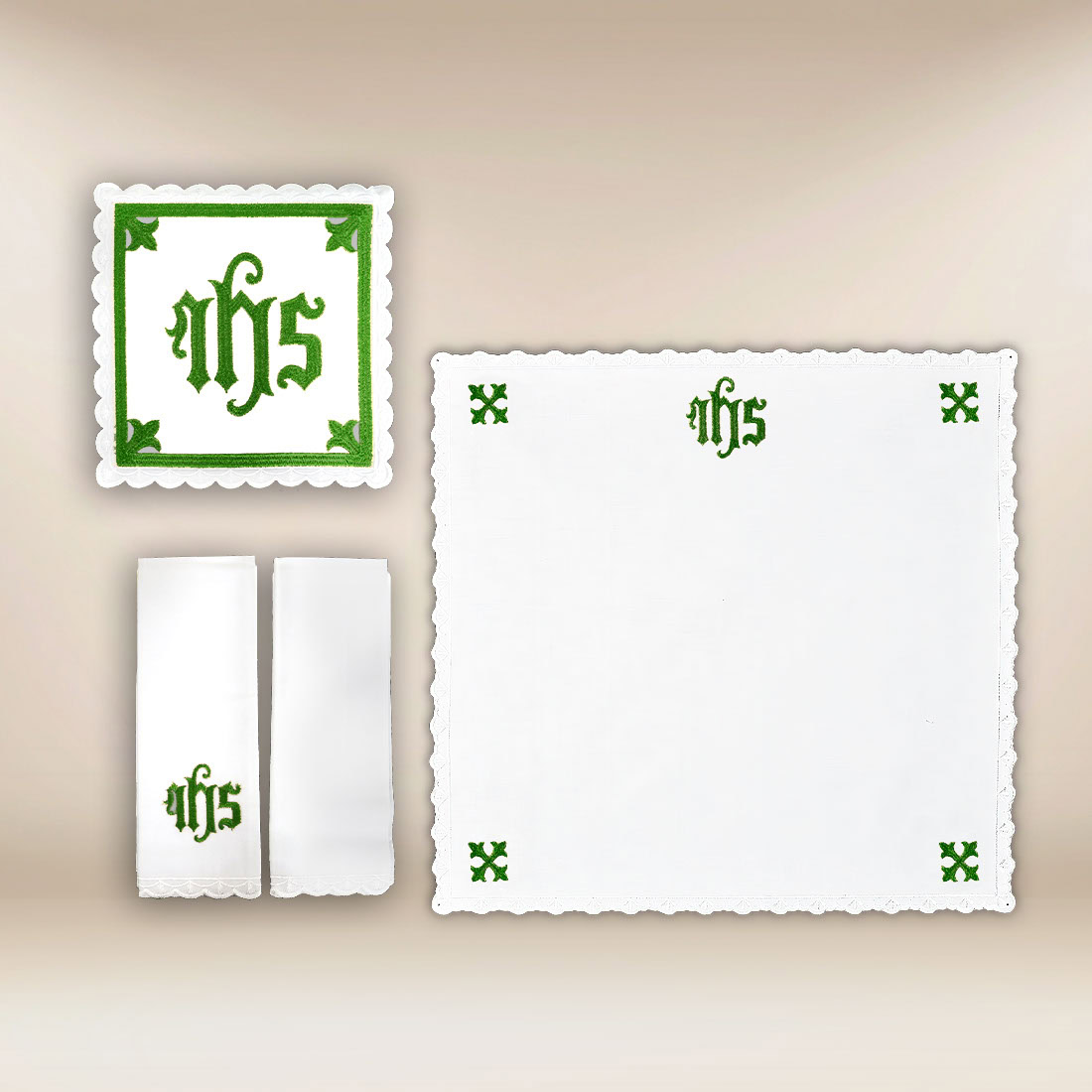 Komplet składa się z palki haftowanej, korporału haftowanego, puryfikaterza oraz ręczniczka, tworząc pełne i funkcjonalne wyposażenie kielicha mszalnego. Centralnym motywem dekoracyjnym jest monogram IHS, jednoznacznie odnoszący się do imienia Jezusa Chrystusa i tajemnicy Eucharystii. Harmonijne rozmieszczenie haftu nadaje całości równowagę i porządek, charakterystyczne dla klasycznego stylu katedralnego.