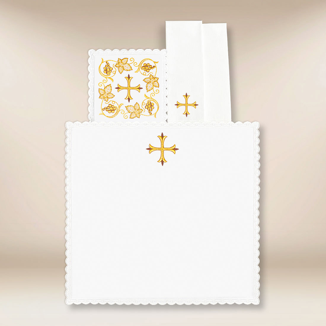 Centralnym motywem dekoracyjnym kompletu jest haftowany krzyż, który stanowi najważniejszy symbol chrześcijaństwa i bezpośrednie odniesienie do ofiary Chrystusa. Subtelne rozmieszczenie haftu nadaje całości spójny i uporządkowany charakter, nie zakłócając skupienia liturgicznego, a jednocześnie podkreślając sakralną rangę sprawowanej Eucharystii. Klasyczna kompozycja sprawia, że komplet pozostaje uniwersalny i odpowiedni do użytku przez cały rok liturgiczny.