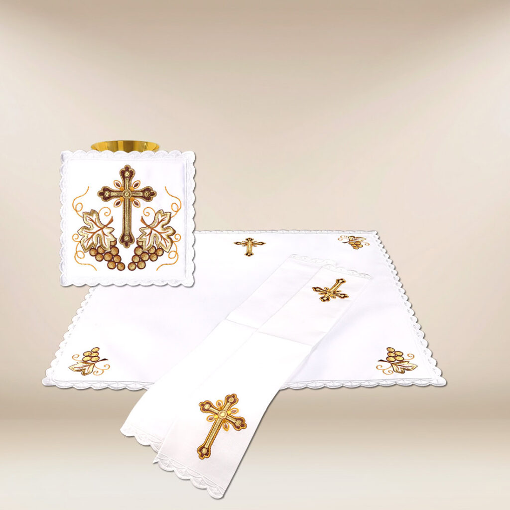 Haftowana bielizna kielichowa wykonana została z najwyższej jakości tkanin, dobranych z myślą o trwałości, estetycznym wyglądzie oraz funkcjonalności w codziennej posłudze liturgicznej. Precyzja wykonania i dbałość o detale sprawiają, że komplet zachowuje swój nienaganny wygląd nawet przy częstym użytkowaniu.