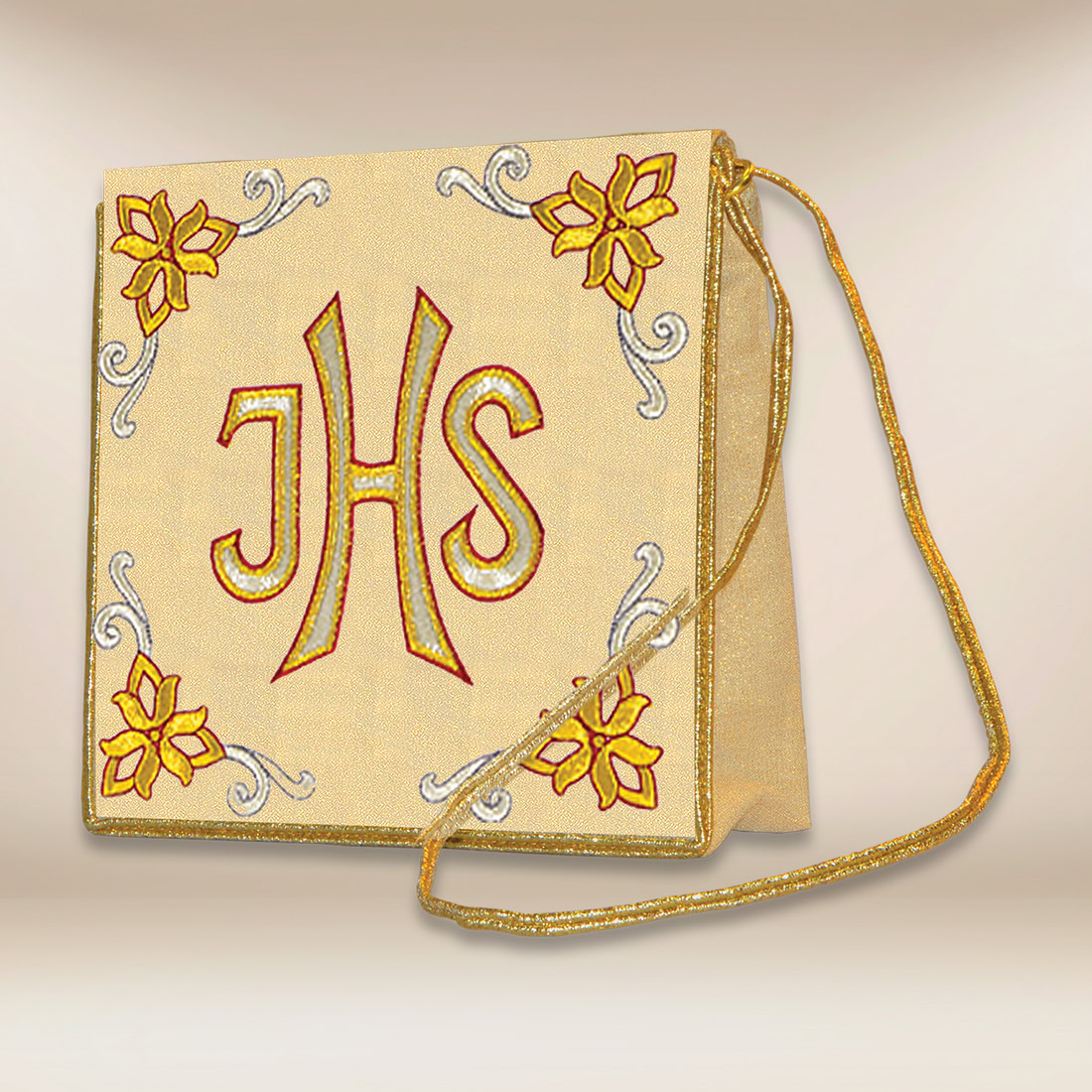Bursa haftowana z motywem IHS to elegancki i symboliczny element wyposażenia liturgicznego, wykonany z wysokiej jakości tkaniny w jasnym kolorze. Zdobiona precyzyjnym haftem złotą i czerwoną nicią, przedstawia chrystogram IHS – tradycyjny symbol Imienia Jezus, będący wyrazem wiary i czci wobec Najświętszego Sakramentu.