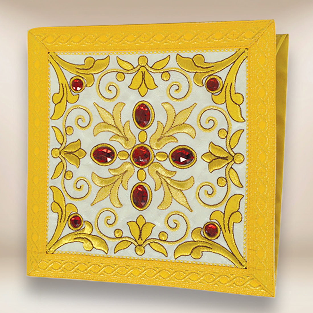 Haftowana bursa liturgiczna ecru z tkaniny żakardowej, zdobiona złotą nicią, kamieniami i pasmanterią.