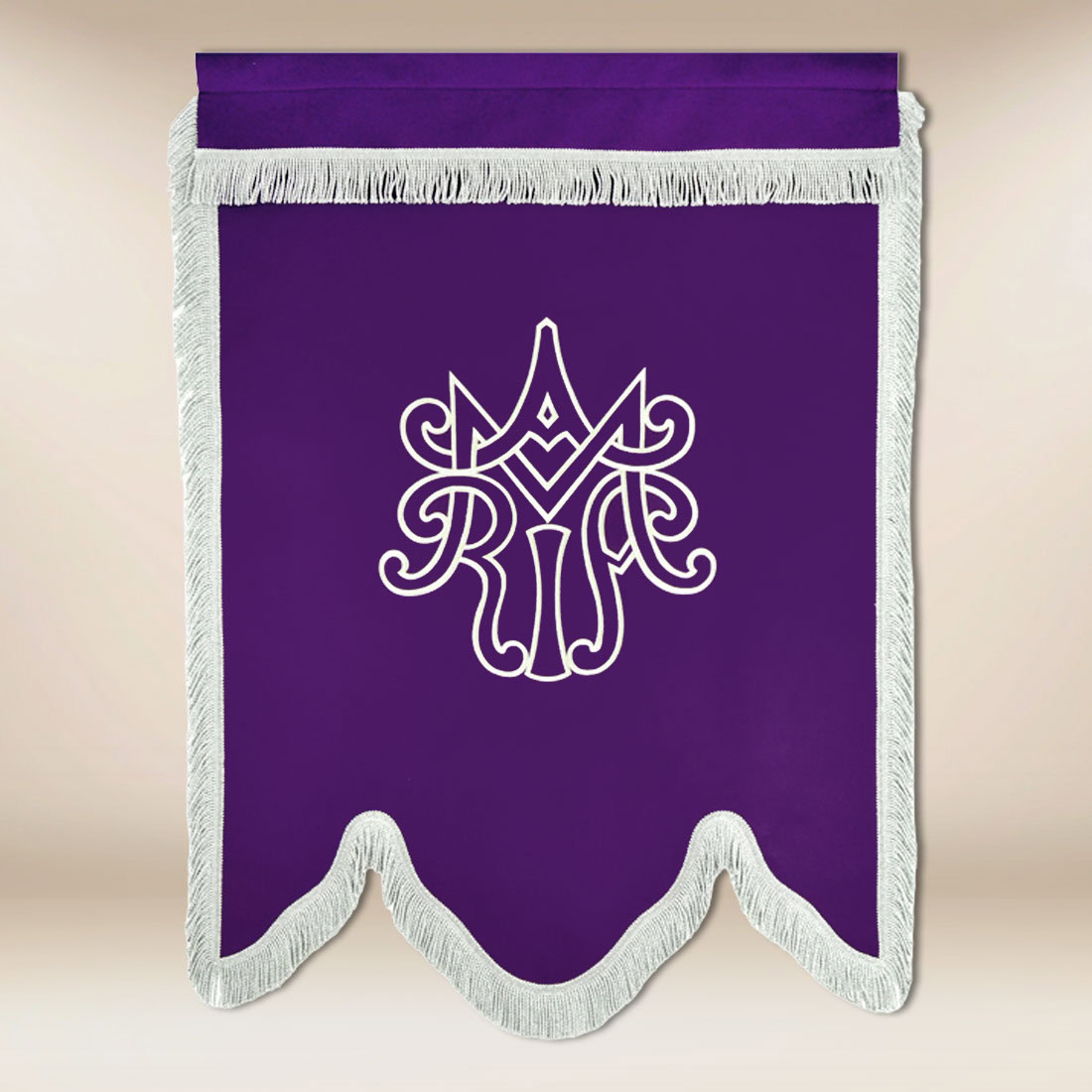 Głęboki, liturgiczny odcień fioletu przywołuje ducha pokuty i refleksji, a delikatne motywy roślinne dyskretnie dopełniają kompozycję. Rewers zdobi symboliczny monogram maryjny, który w naturalny sposób podkreśla sakralny charakter chorągwi.