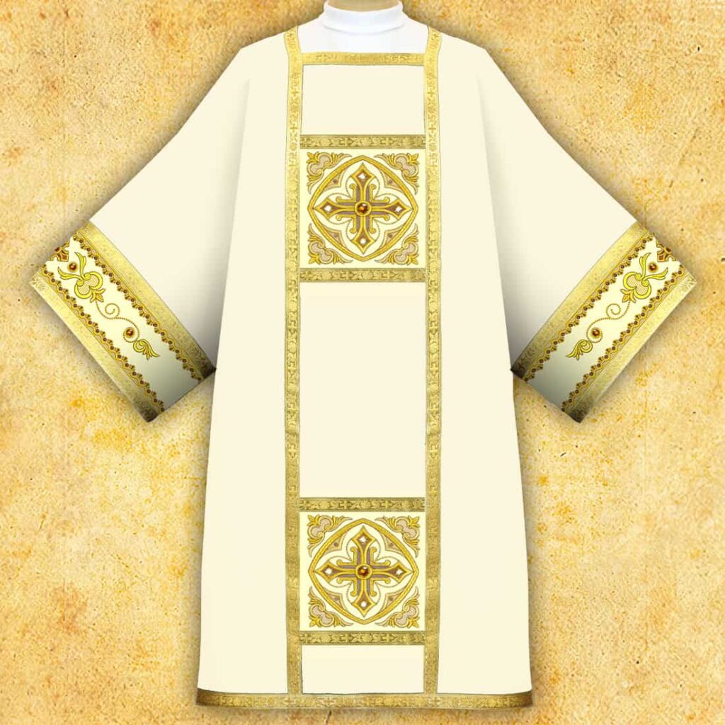 Elegancka dalmatyka ecru zdobiona złotym haftem krzyży na pionowym panelu i mankietach.