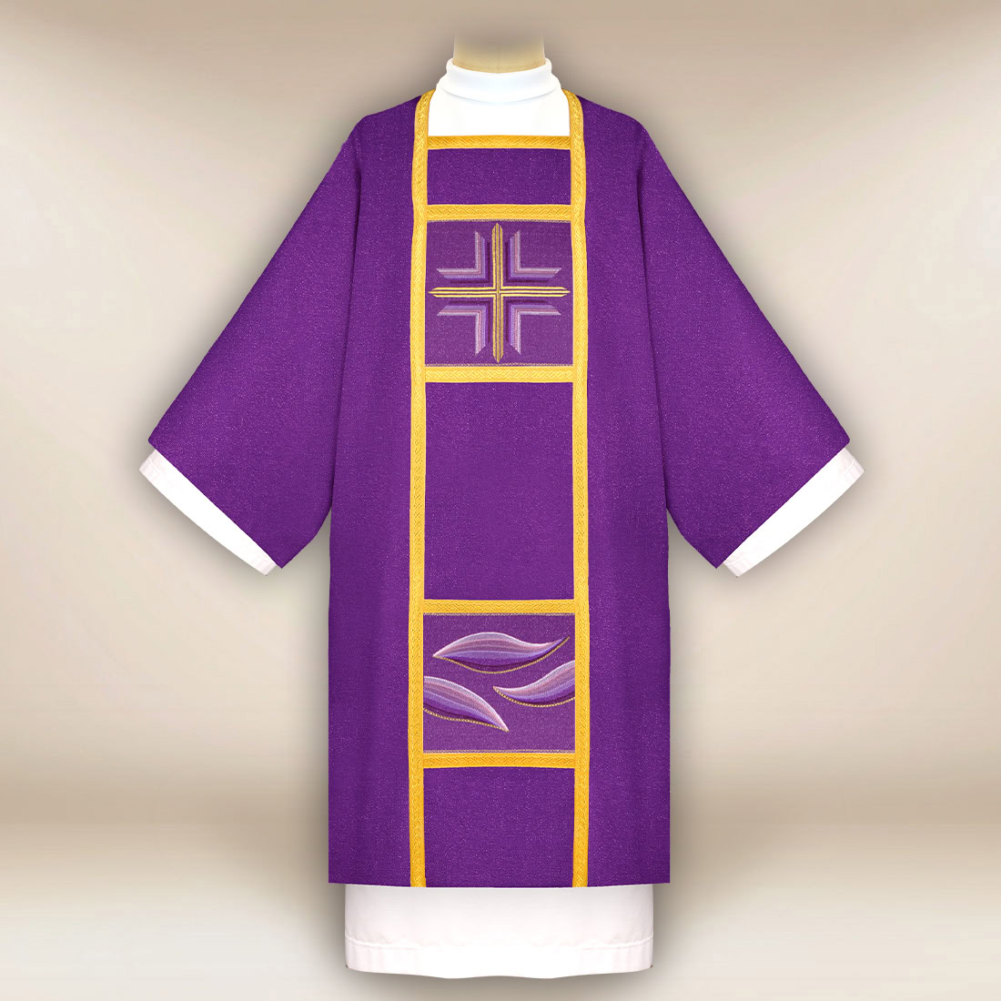 Dalmatyka liturgiczna fioletowa haftowana to elegancka, pełna symboliki szata przeznaczona dla diakona, stworzona z myślą o celebracjach wymagających skupienia, pokuty i duchowej refleksji. Fiolet od wieków stanowi kolor okresów pokutnych, dlatego szata ta doskonale wpisuje się w liturgię Wielkiego Postu i Adwentu oraz wszelkie nabożeństwa o charakterze modlitewnym. Jej uroczysty wygląd podkreśla zarówno dobór materiału, jak i staranne wykonanie haftu.