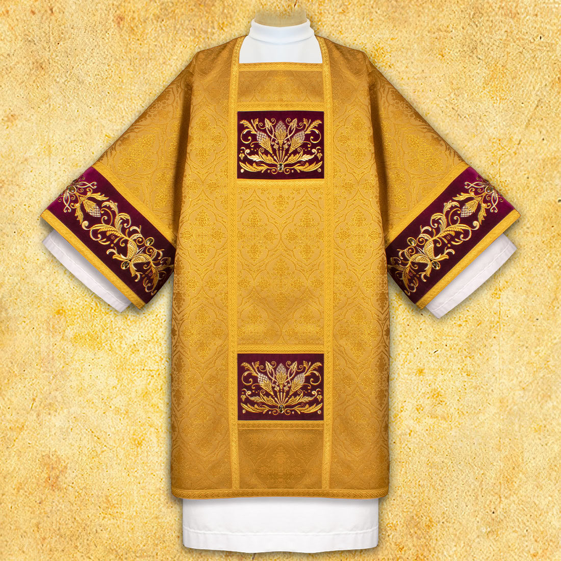 Dalmatyka haftowana złota to wyjątkowa szata liturgiczna, przeznaczona dla diakonów celebrujących podczas uroczystych Mszy Świętych oraz świątecznych obchodów roku kościelnego. Wykonana została z wysokiej jakości tkaniny liturgicznej o eleganckiej, złotej tonacji, która nadaje szacie podniosły, ceremonialny charakter. Nasycona barwa oraz subtelny połysk materiału pięknie współgrają ze światłem ołtarza, podkreślając rangę celebracji.