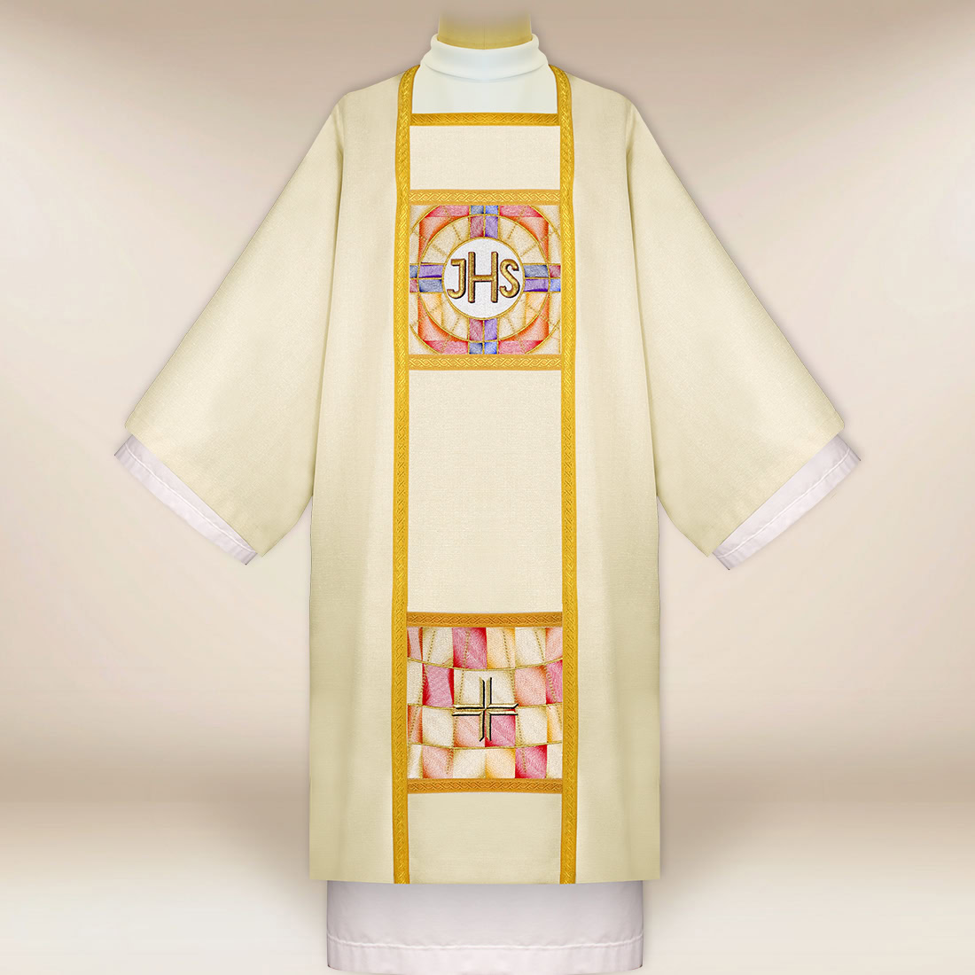 Dalmatyka haftowana z motywem IHS została zaprojektowana z myślą o uroczystej służbie liturgicznej diakona podczas celebracji Mszy Świętej oraz najważniejszych świąt kościelnych. Jej klasyczna, harmonijna forma łączy w sobie elegancję, powagę oraz wyjątkową staranność wykonania, charakterystyczną dla produktów Urbanowicz Haft Polska.