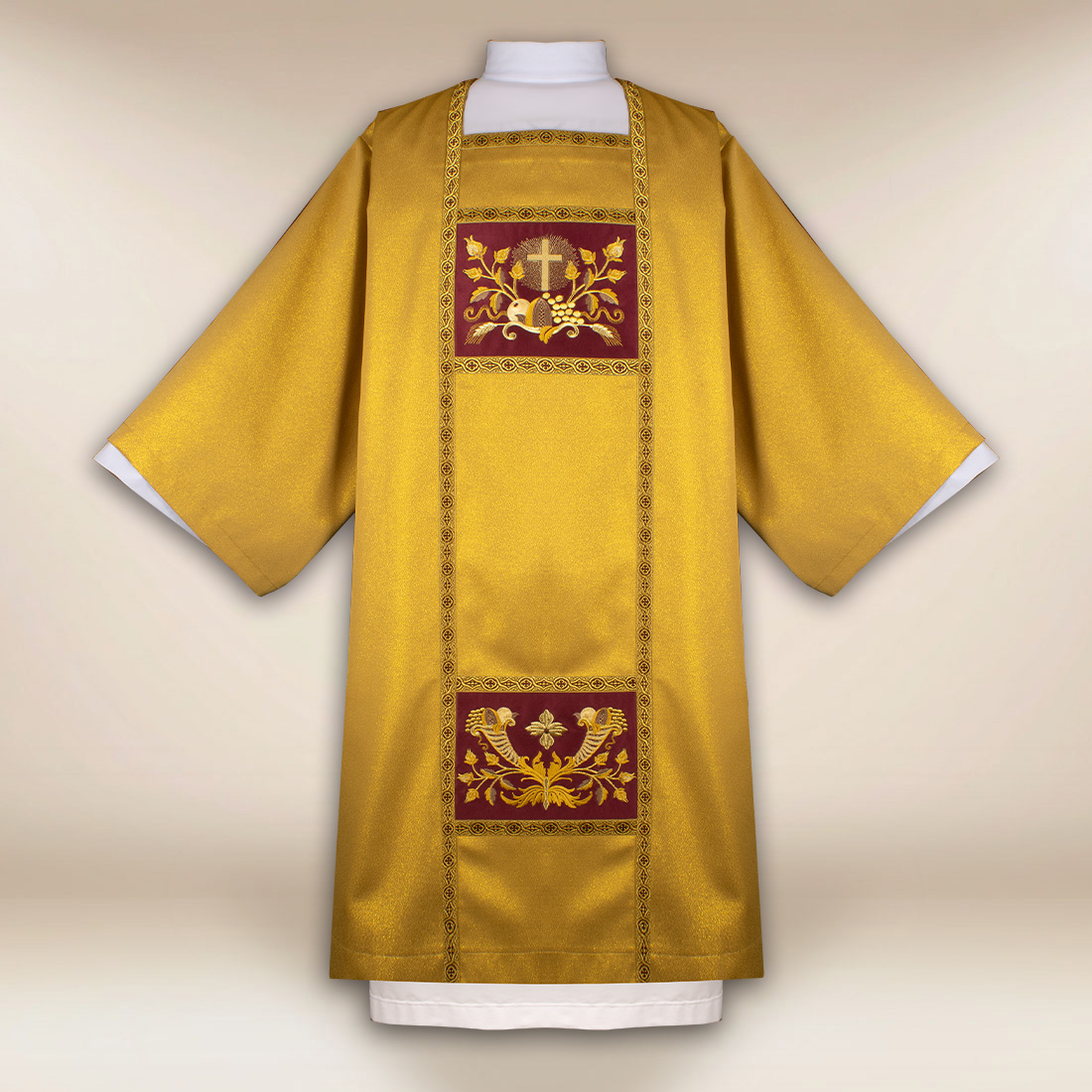 Dalmatyka haftowana złota” Serce Jezusa i Maryi” to wyjątkowa szata liturgiczna, przeznaczona dla diakonów celebrujących podczas uroczystych Mszy Świętych oraz świątecznych obchodów roku kościelnego. Wykonana została z wysokiej jakości tkaniny miodowy brokat o eleganckiej, złotej tonacji, która nadaje szacie podniosły, ceremonialny charakter. Nasycona barwa oraz subtelny połysk materiału pięknie współgrają ze światłem ołtarza, podkreślając rangę celebracji.