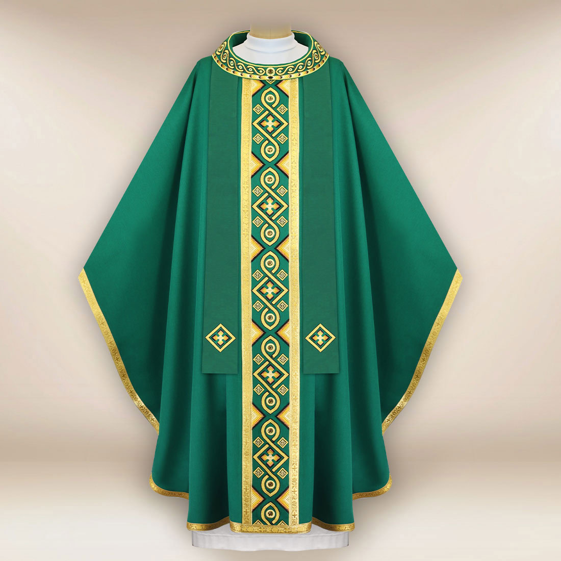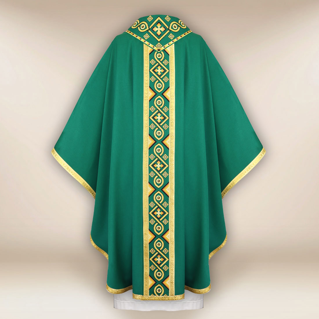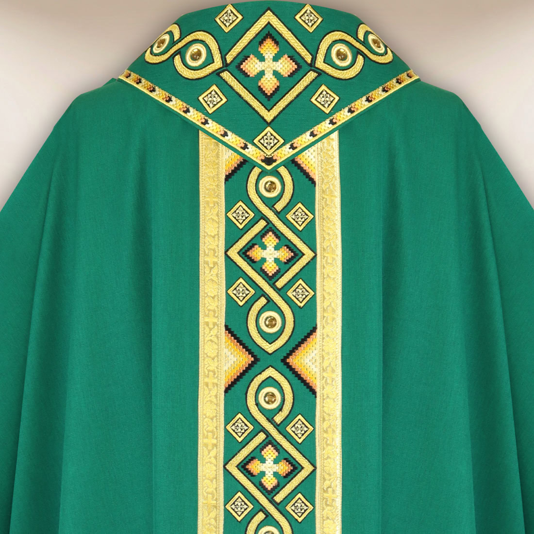 Zdobienia tworzą dopracowaną kompozycję, w której harmonijnie połączono ornamentalny galon oraz elegancki kołnierz. Linie haftu zaprojektowano tak, aby podkreślały pionową sylwetkę szaty i tworzyły wizualną głębię, charakterystyczną dla wysokiej klasy tekstyliów liturgicznych. Hafty wykonano z precyzją i dbałością o detal – każdy element ornamentu układa się w spójną i estetyczną całość, podkreślając uroczysty charakter celebracji. Wykończenie dekoracyjną pasmanterią dopełnia projektu, tworząc wrażenie pełnego, eleganckiego i wyważonego dzieła.