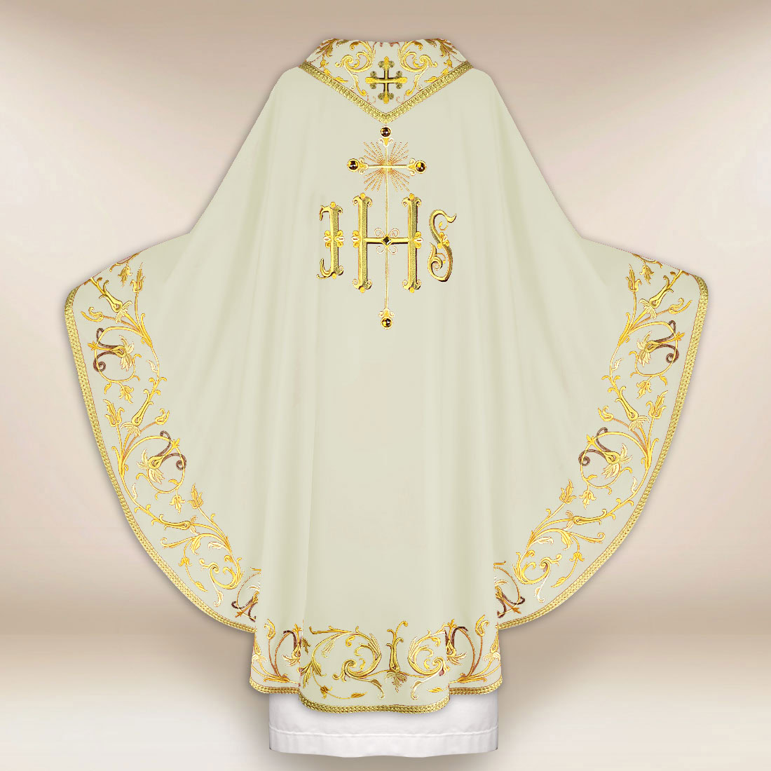 Ornat haftowany IHS ecru to szata liturgiczna, która łączy klasyczną formę z głęboką symboliką chrystologiczną, od wieków obecną w tradycji Kościoła. Centralnie umieszczony znak IHS – monogram Imienia Jezus – stanowi serce kompozycji i czytelny znak wiary, wokół którego zbudowano harmonijną całość zdobień.
