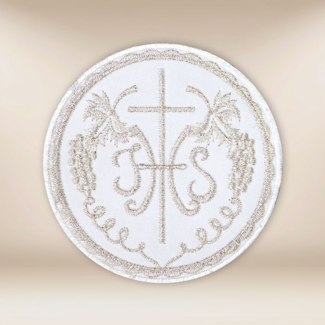 Hostia komunijna haftowana opiera się na harmonijnej, okrągłej formie, otoczonej delikatnym obramowaniem. Ornament roślinny subtelnie dopełnia centralny symbol, wprowadzając ład, symetrię i elegancję. Całość została zaprojektowana z myślą o zachowaniu liturgicznej powagi oraz estetyki odpowiedniej dla uroczystości sakramentalnej, nie dominując stroju, lecz podkreślając jego znaczenie.