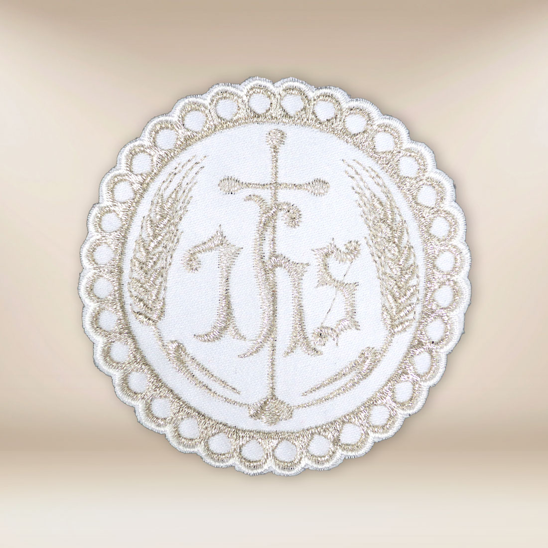 Hostia komunijna haftowana IHS to klasyczna naszywka sakralna zaprojektowana z myślą o godnym podkreśleniu uroczystości I Komunii Świętej. Motyw okrągłej Hostii z wyraźnym monogramem IHS, zwieńczonym krzyżem i uzupełnionym kłosami zboża, odwołuje się bezpośrednio do tajemnicy Eucharystii — Ciała Chrystusa, które staje się duchowym pokarmem wiernych.