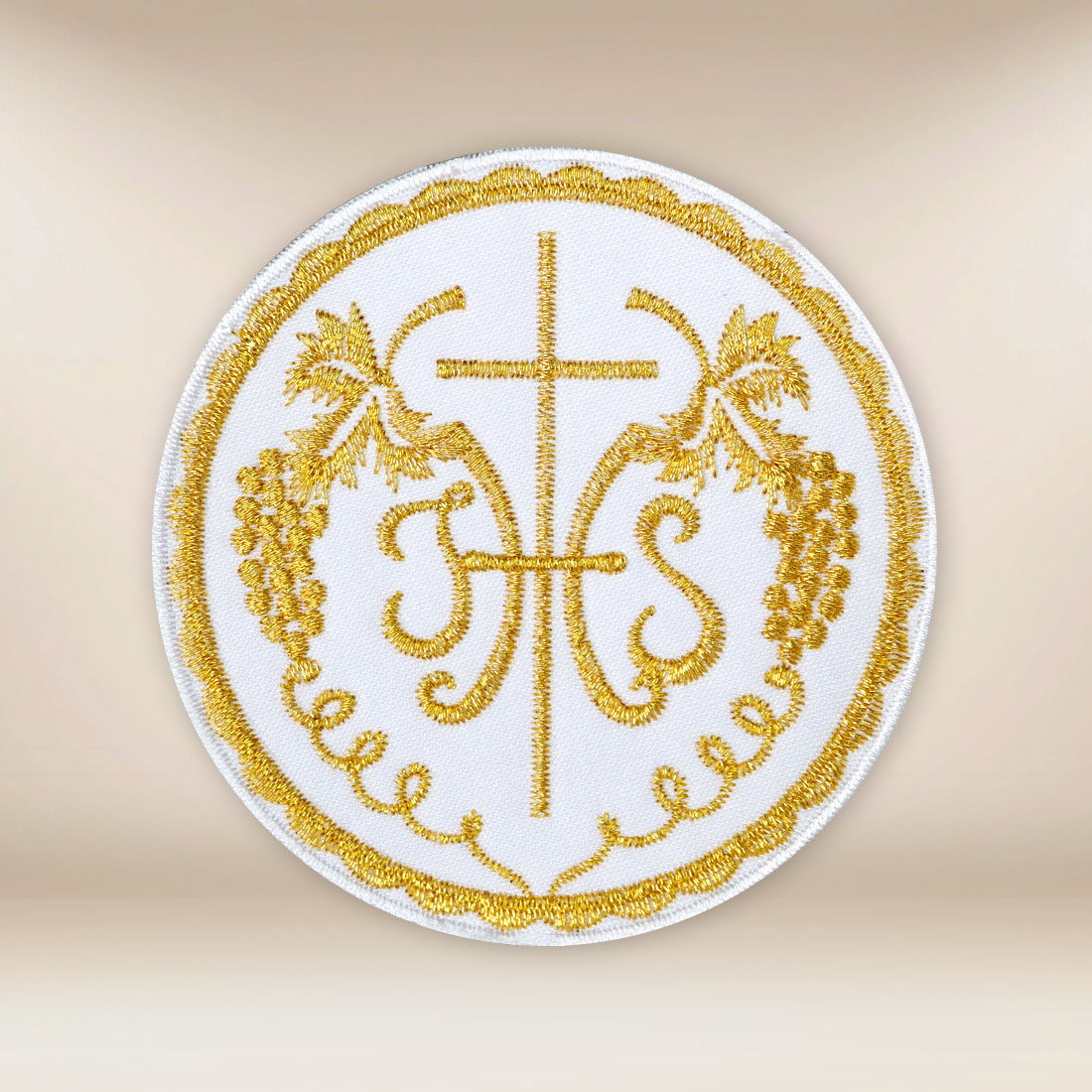 Hostia komunijna haftowana to klasyczny motyw eucharystyczny, nierozerwalnie związany z uroczystością I Komunii Świętej. Symbol hostii z wyraźnym monogramem IHS oraz krzyżem odwołuje się bezpośrednio do obecności Chrystusa w Najświętszym Sakramencie, przypominając o istocie Eucharystii i jej centralnym miejscu w życiu Kościoła. Jest to znak głęboko zakorzeniony w tradycji liturgicznej, czytelny i pełen duchowego znaczenia.