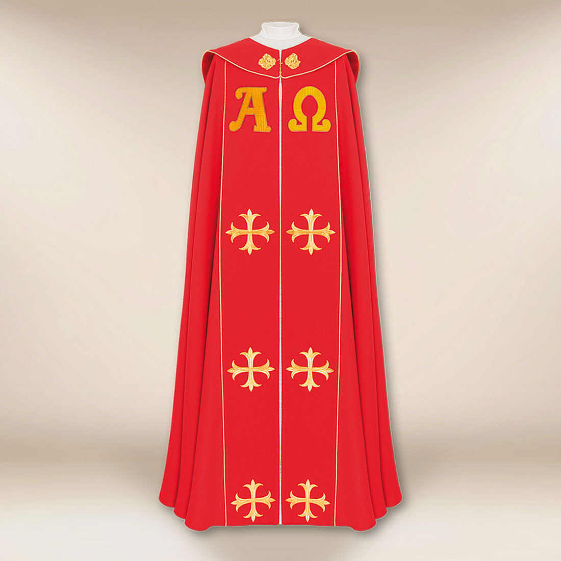 Kapa haftowana czerwona Alfa Omega PX to szata o wyjątkowej sile symbolicznej, przeznaczona do uroczystych celebracji oraz liturgii podkreślających zwycięstwo Chrystusa i pełnię Jego królewskiej chwały. Wykonana z wysokiej jakości satyno-tafty, łączy w sobie miękkość, trwałość i subtelny połysk, dzięki którym prezentuje się niezwykle szlachetnie. Tkanina dobrze układa się podczas procesji, zapewniając celebransowi komfort i swobodę ruchów.