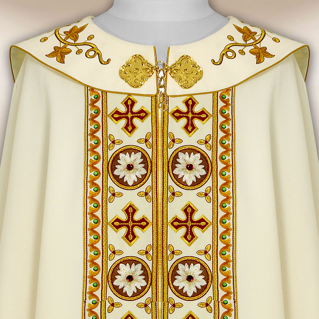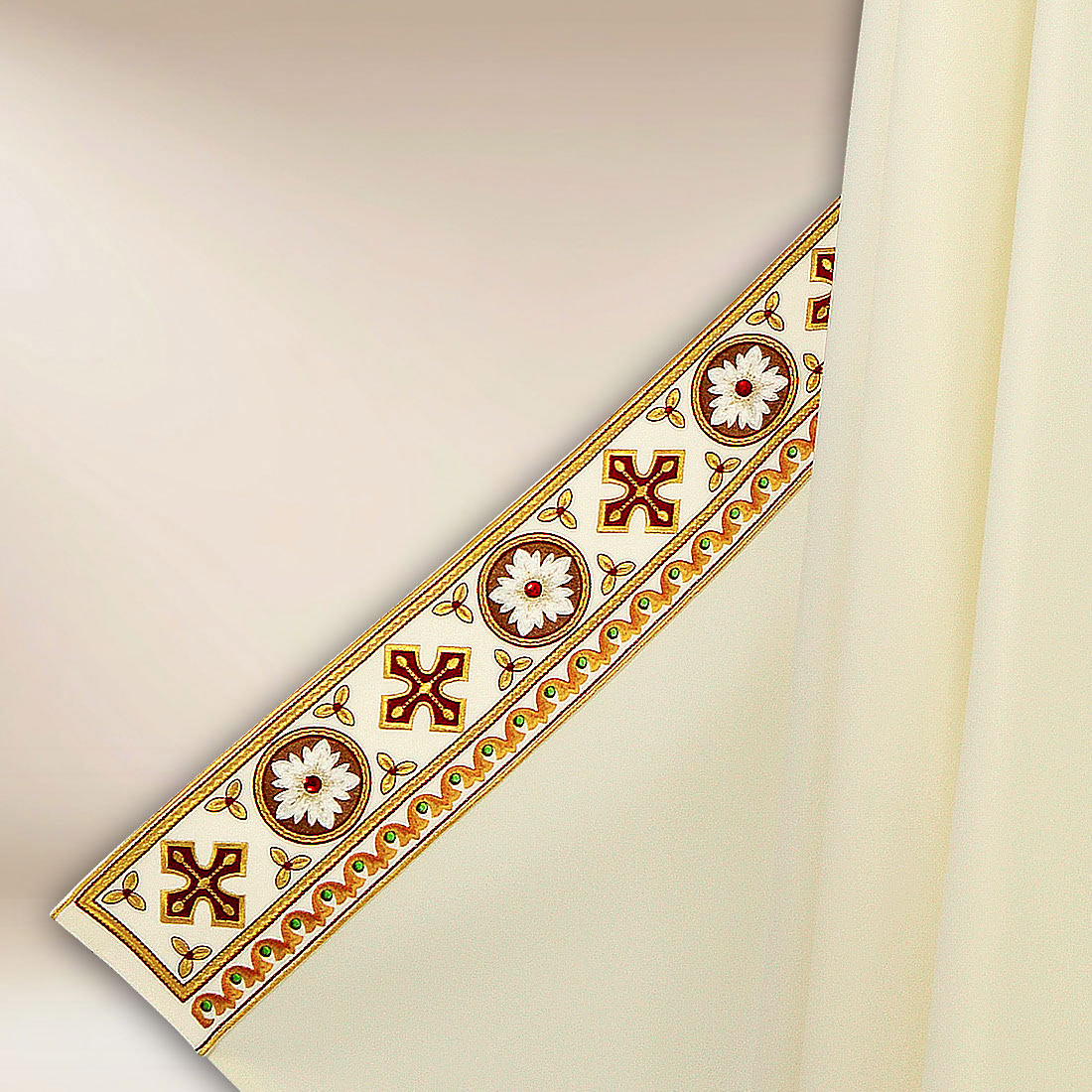 Kołnierz oraz galony zostały wykończone haftem o bogatej, ornamentalnej linii, która dodaje szacie wyjątkowego prestiżu. Subtelne aplikacje wykonane ręcznie podkreślają głębię haftu oraz celebracyjny charakter tej szaty. Uzupełniają je elementy pasmanteryjne, dobrane tak, aby harmonijnie komponować się z całą kompozycją bez przesadnej dekoracyjności.