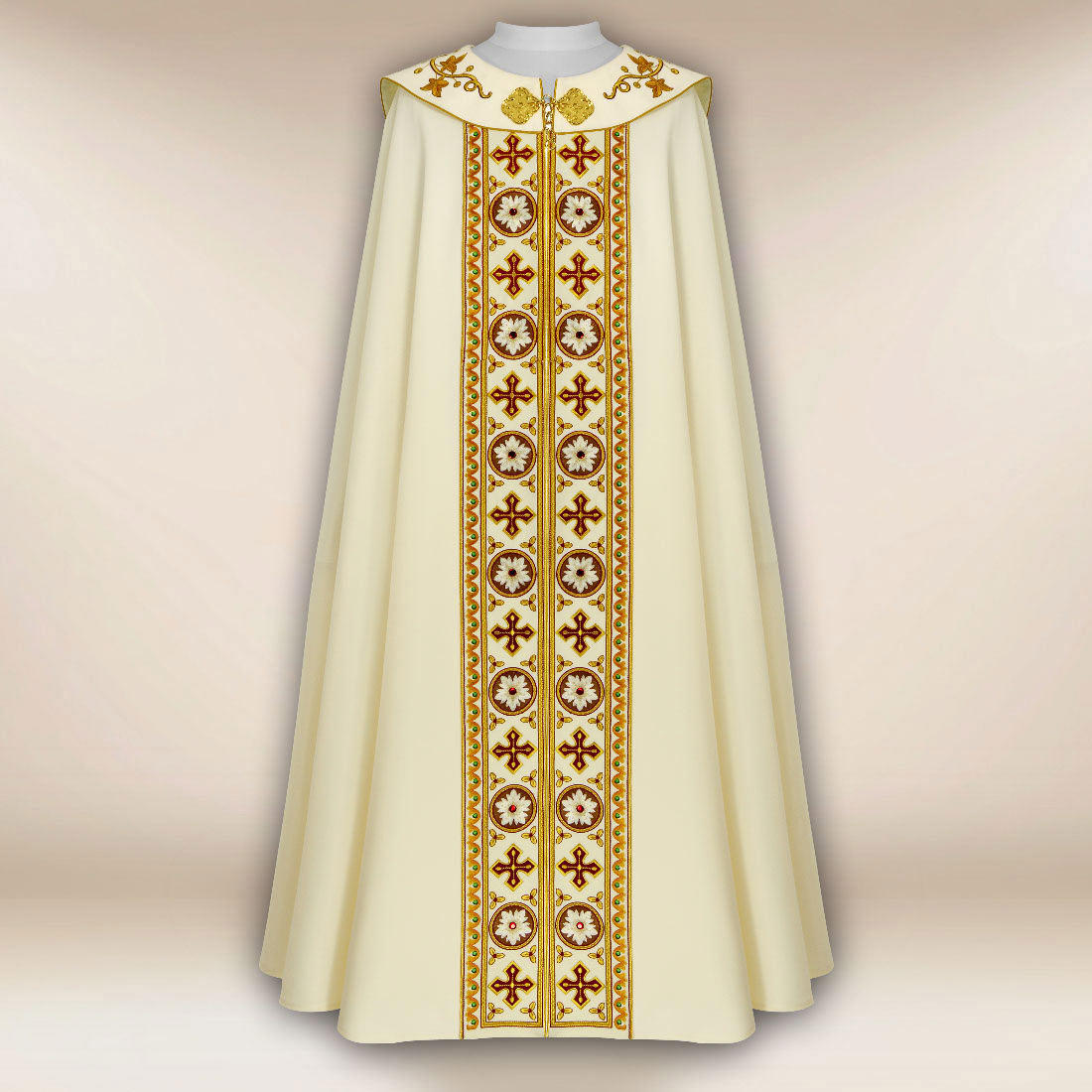 W komplecie znajduje się dopasowana stuła wewnętrzna, utrzymana w tej samej estetyce, co nadaje całemu zestawowi spójność liturgiczną. Uniwersalny rozmiar kapy pozwala na wygodne dopasowanie do każdej sylwetki kapłana, a jej klasyczny krój zapewnia elegancję niezależnie od kontekstu liturgicznego.