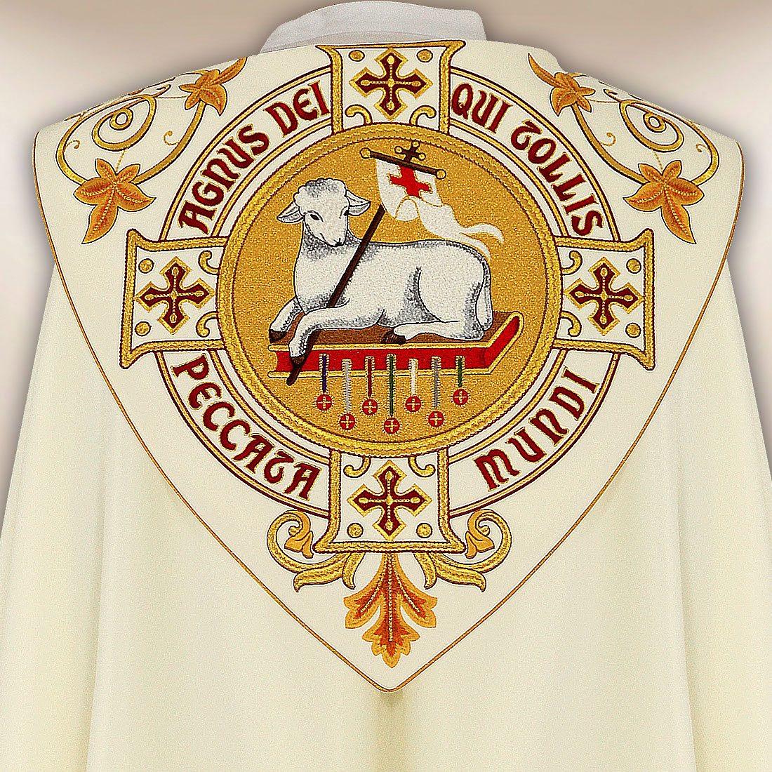 Głównym elementem dekoracyjnym szaty jest haftowany wizerunek Baranka – symbol Chrystusa, ofiary i odkupienia. Umieszczony centralnie motyw pozostaje czytelny i elegancki, zachowując właściwą proporcję wobec całej kompozycji. Jego forma nawiązuje do klasycznej ikonografii, dzięki czemu kapa imponuje zarówno w ruchu, jak i podczas statycznych momentów liturgii.