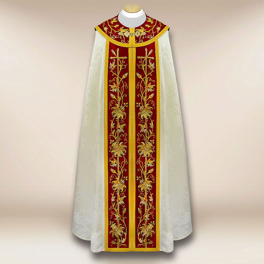 Kapa haftowana ecru bordo zachowuje miękkie, eleganckie układanie dzięki jakości zastosowanej tkaniny, co sprawia, że prezentuje się doskonale zarówno podczas procesji, jak i statycznych celebracji przy ołtarzu. W komplecie znajduje się stuła wewnętrzna, wykonana w tej samej stylistyce, co pozwala zachować pełną spójność liturgiczną.