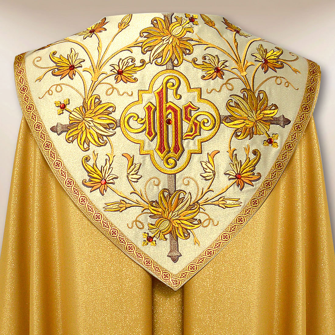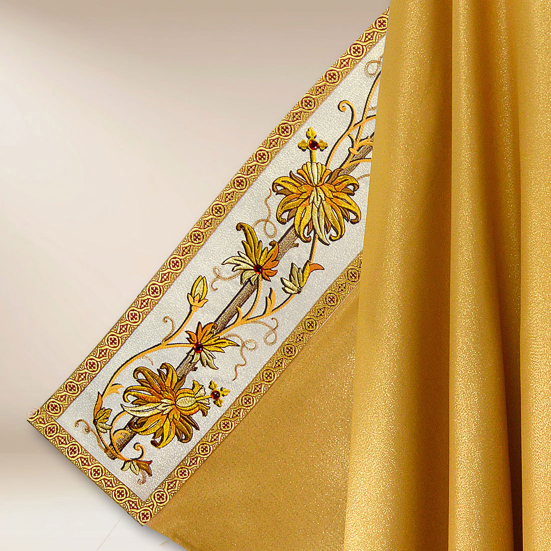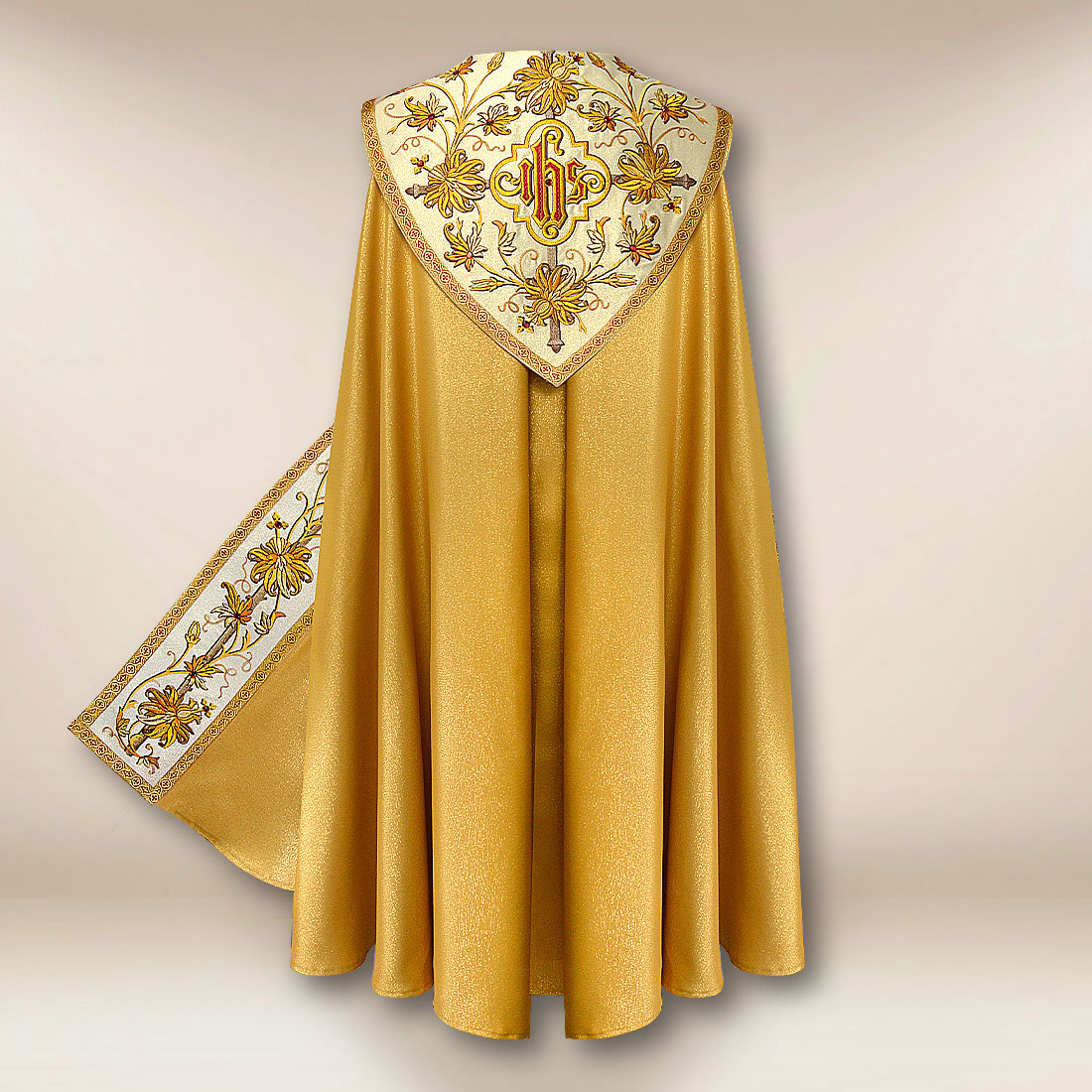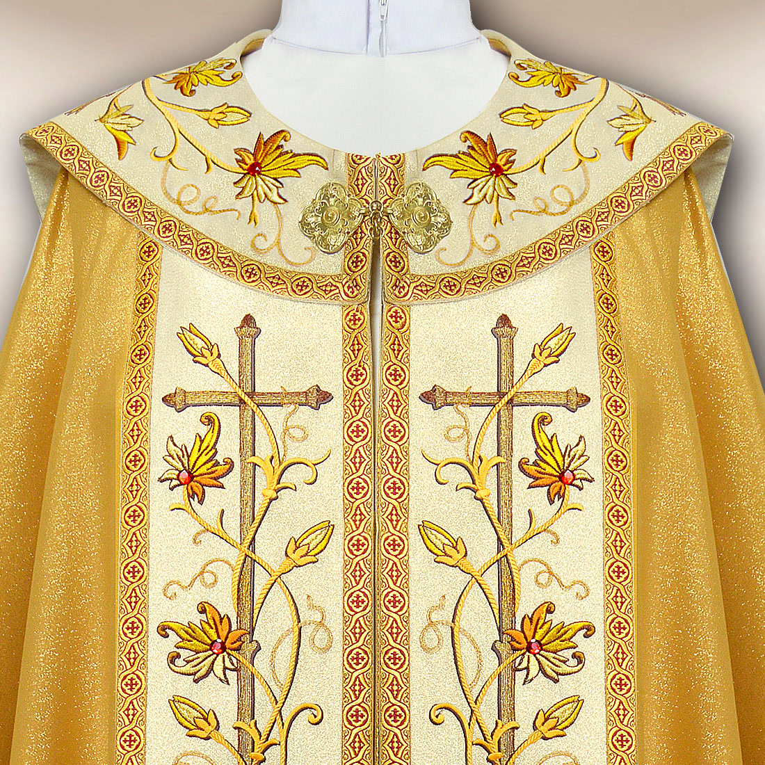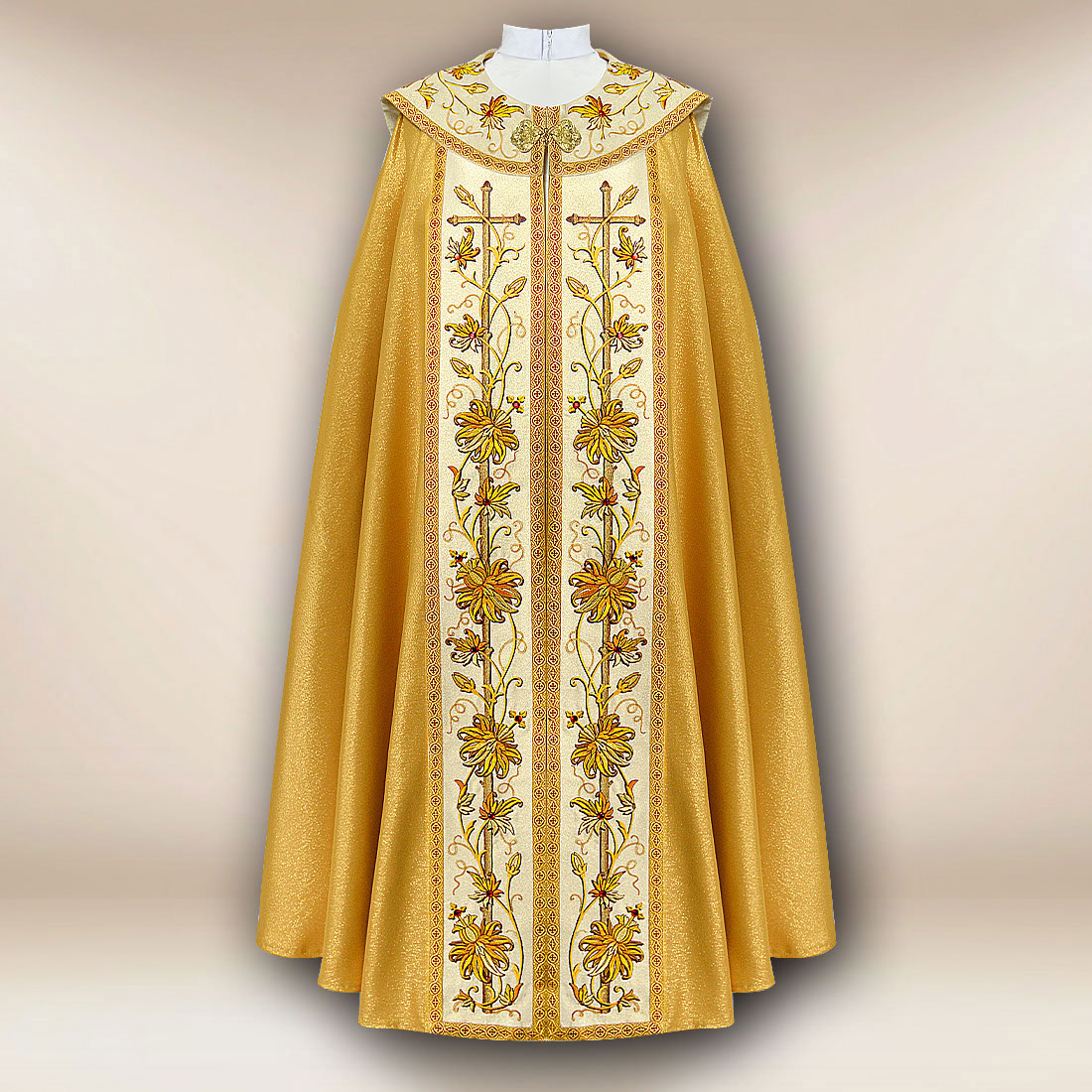 Ekskluzywna kapa haftowana „Classico Gold” to elegancka szata liturgiczna wykonana z wysokiej jakości tkaniny Damastic Gold o subtelnym, złotym połysku.