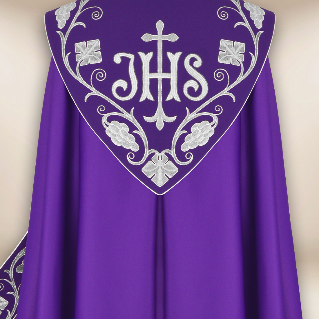 Kapa liturgiczna haftowana „IHS” to szata zaprojektowana z myślą o uroczystych celebracjach, które wymagają szczególnej oprawy oraz głębokiego symbolicznego przekazu. Centralnym elementem kompozycji jest precyzyjnie wykonany haft „IHS”, będący jednym z najstarszych i najważniejszych chrystologicznych znaków, wyrażających cześć i oddanie Chrystusowi. Motyw otaczają eleganckie ornamenty roślinne, których dekoracyjna forma subtelnie nawiązuje do tradycyjnych wzorów liturgicznych.