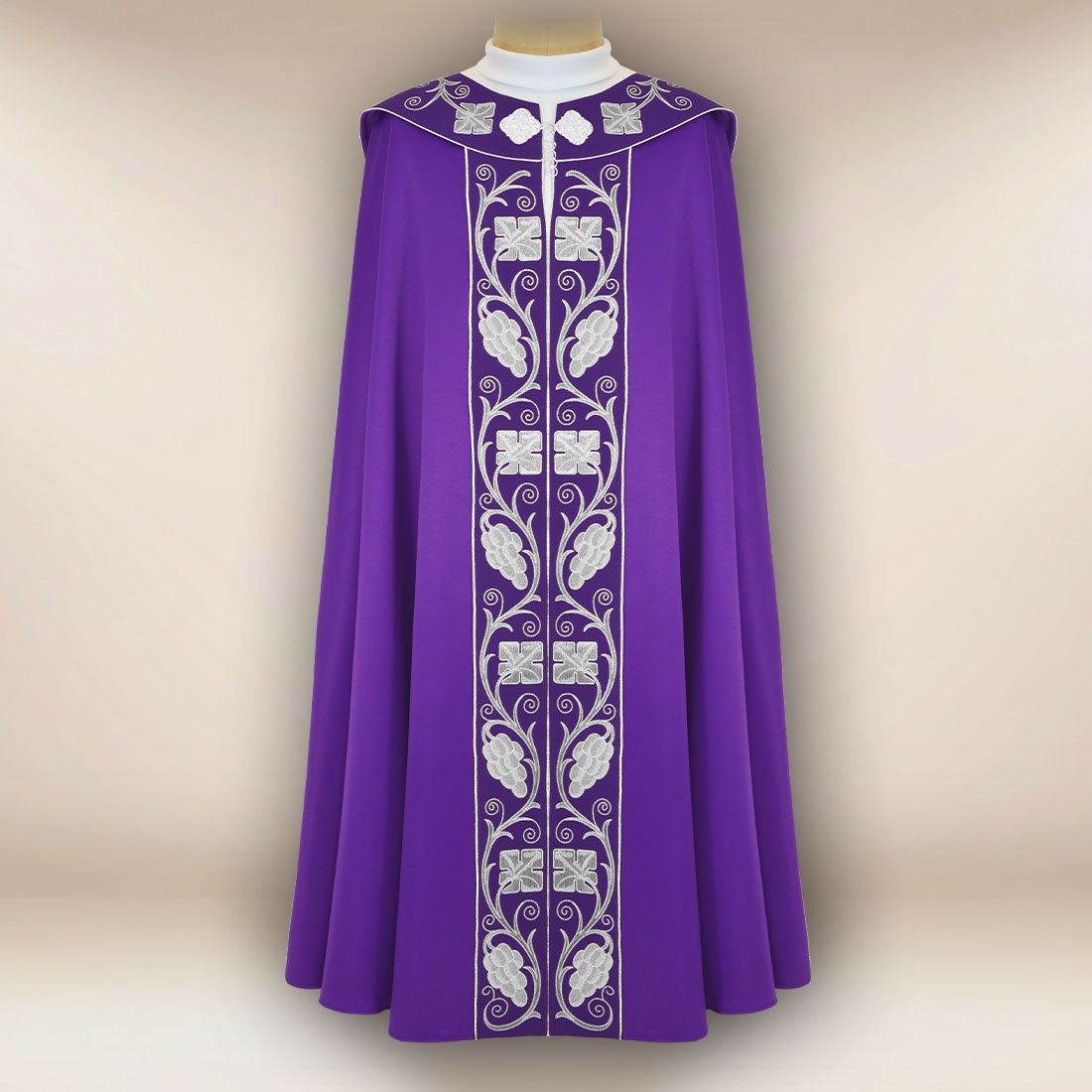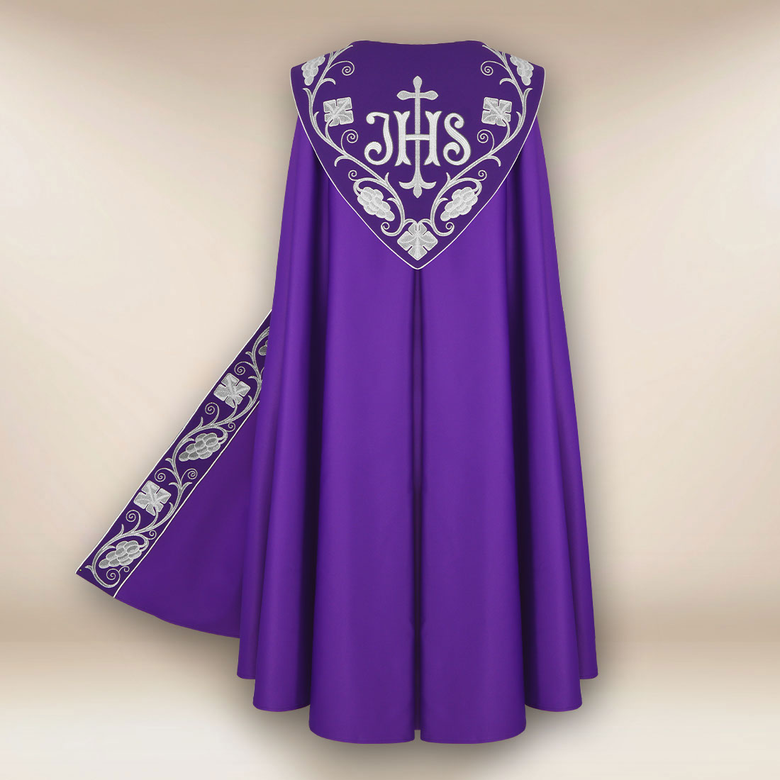 Szata została uszyta z wysokiej jakości tkaniny satynowej, która pięknie się układa, jest lekka i przyjemna w dotyku, a jej delikatny połysk podkreśla uroczysty charakter nabożeństw. Fioletowy kolor czyni kapę idealnym wyborem na okresy pokuty, rekolekcje, adoracje oraz liturgię Wielkiego Postu. Całość została starannie wykończona, a srebrna klamra dodaje kompozycji harmonii i elegancji.