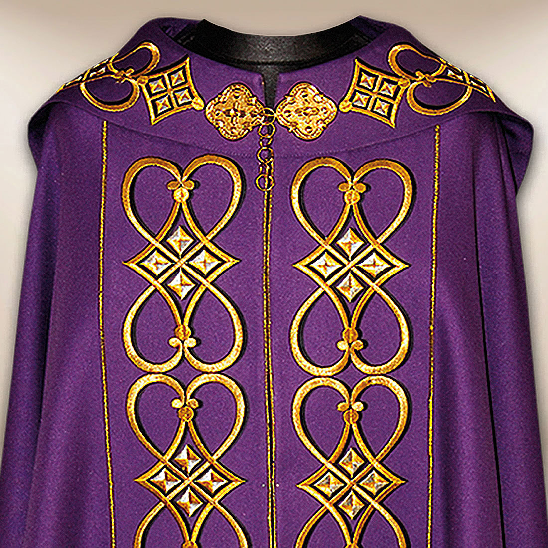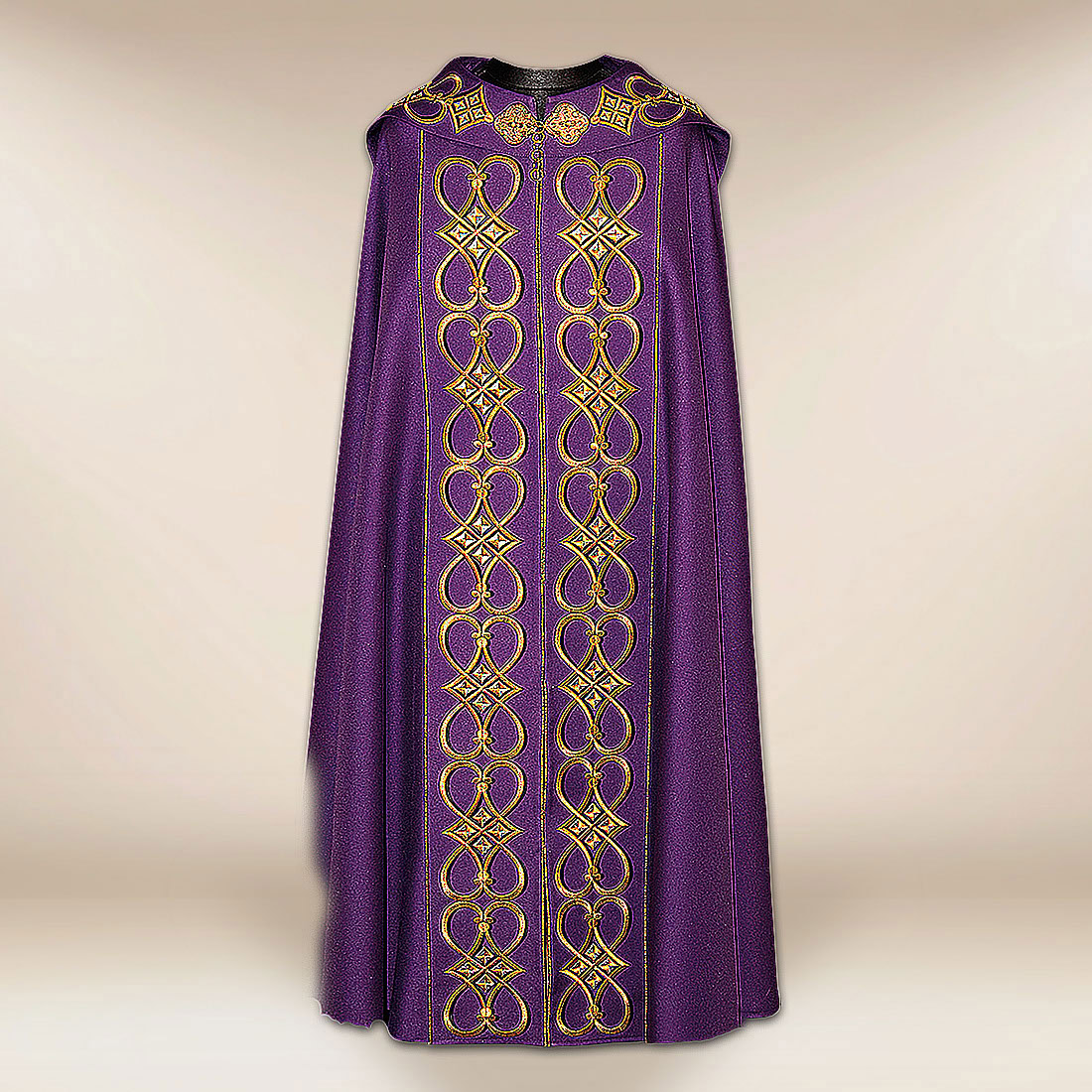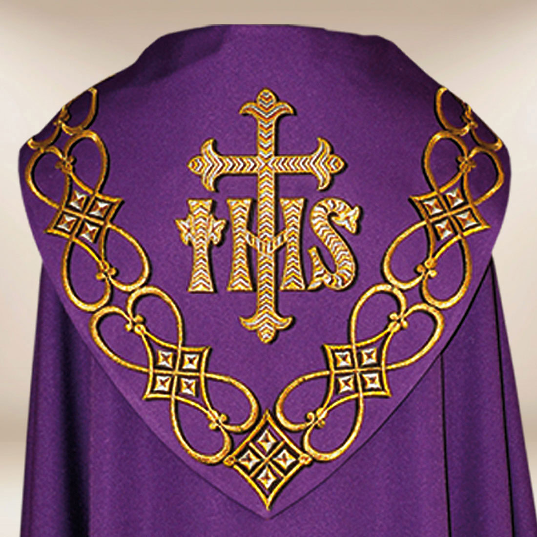 Kapa haftowana „IHS” została stworzona z myślą o uroczystych celebracjach liturgicznych, procesjach oraz nabożeństwach okresów pokuty i refleksji. Kapa haftowana „IHS” wyróżnia się głębokim fioletowym kolorem, który w tradycji Kościoła symbolizuje skupienie, pokutę i duchową przemianę. Centralnym elementem kompozycji jest haftowany symbol IHS z krzyżem, umieszczony na kapturze, podkreślający obecność Chrystusa w Liturgii. Bogaty, złoty ornament biegnący wzdłuż frontu tworzy majestatyczną, harmonijną całość.