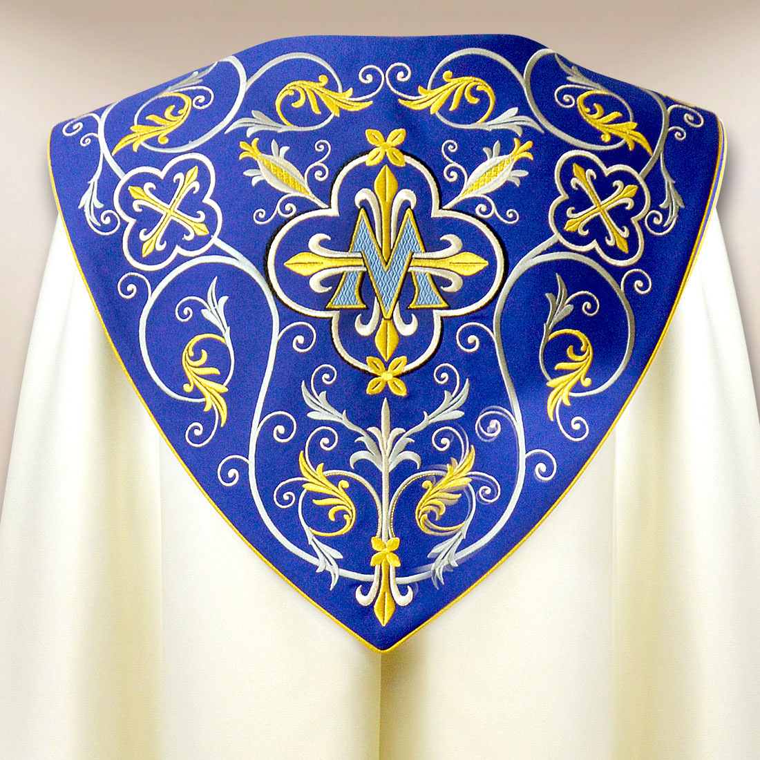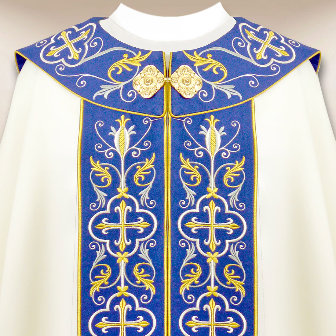 Całość zdobi starannie wykonany wzór maryjny — dyskretny, a zarazem wyrazisty, dopracowany z myślą o wyważonej symbolice. Kołnierz oraz galony przygotowano w tonacji błękitnej i wzbogacono zdobieniami wykonanymi złotą oraz srebrną nicią. Hafty tworzą rytmiczną kompozycję, która prowadzi wzrok wzdłuż linii szaty, podkreślając jej liturgiczną funkcję. Ornamenty rozmieszczono tak, aby zachować równowagę między dekoracyjnością a elegancją, bez efekciarstwa, za to z naciskiem na sakralny charakter.