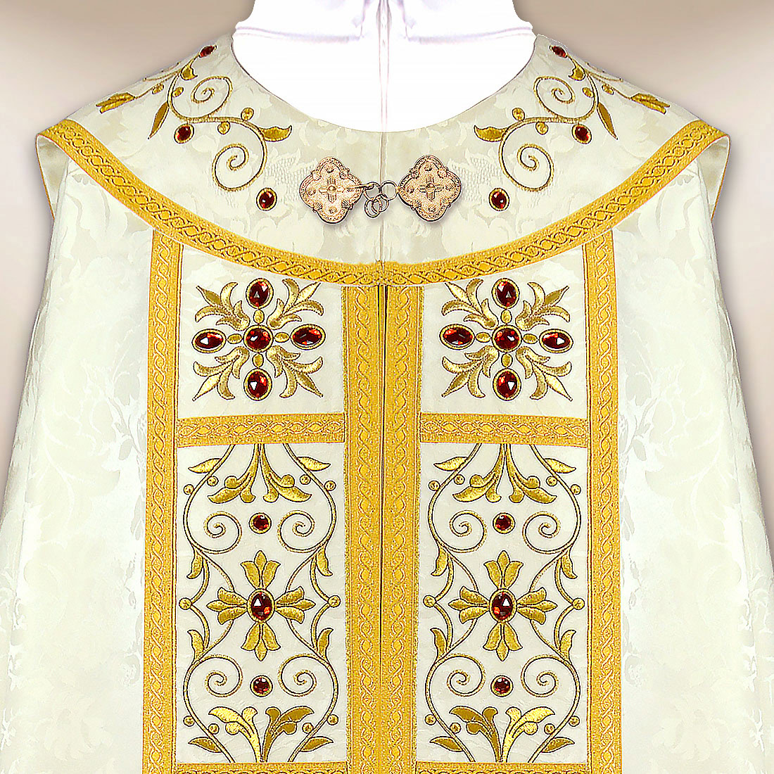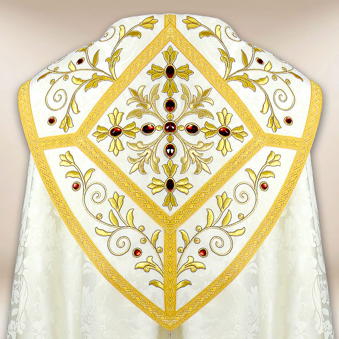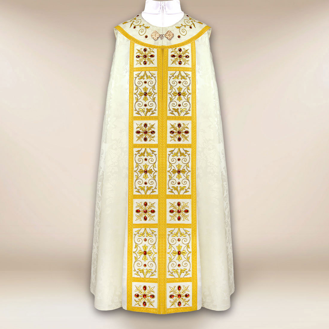 Całość zdobi bogaty haft wykonany złotą nicią, który nadaje szacie wyjątkowego, sakralnego charakteru. Dodatkowe ręczne zdobienia kamieniami podkreślają jej uroczysty styl, a żakardowa, połyskująca pasmanteria stanowi eleganckie wykończenie, dopełniające całości. Każdy detal został wykonany z najwyższą starannością, co czyni tę kapę nie tylko szatą liturgiczną, ale również dziełem sztuki sakralnej. Haftowana kapa liturgiczna w kolorze ecru wyróżnia się na tle innych produktów.