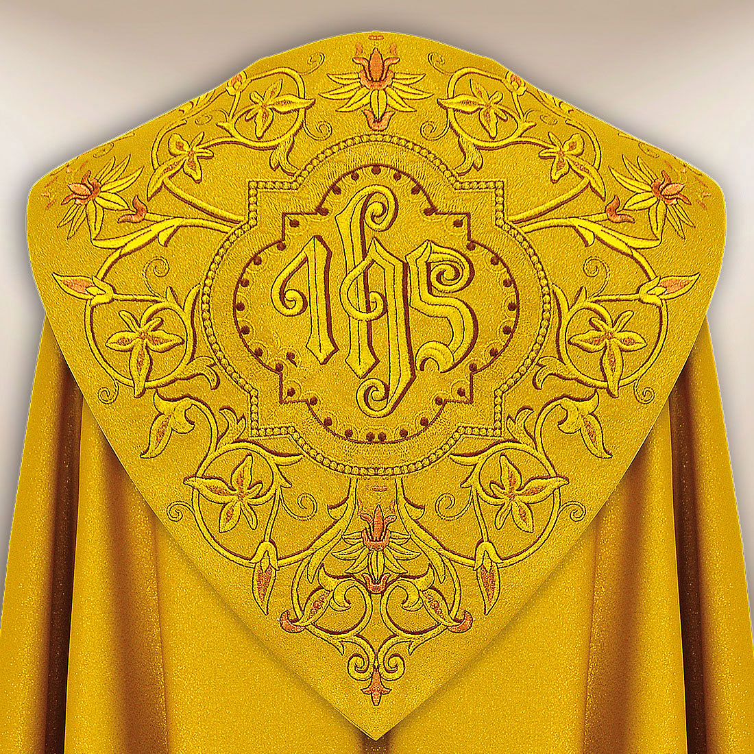 Elegancka kapa haftowana złota IHS to wyjątkowa szata liturgiczna, która łączy klasyczne piękno, podniosłą stylistykę i rzemieślniczą precyzję wykonania. Powstała z wysokiej jakości tkaniny brokatowej w odcieniu starego złota, znanej z subtelnego połysku i lekkiej, miękko układającej się struktury. Materiał ten dodaje całości eleganckiej świetlistości, która doskonale podkreśla uroczysty charakter celebracji liturgicznych. Szata prezentuje się niezwykle harmonijnie zarówno w świetle naturalnym, jak i w oświetleniu kościelnym, tworząc efekt spójności z wystrojem prezbiterium.