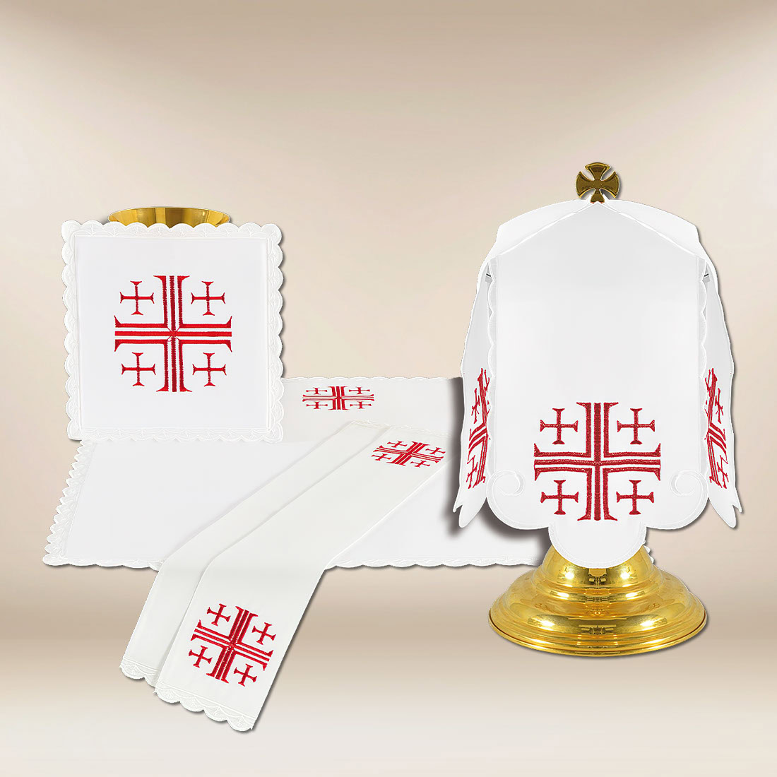 Komplet bielizny kielichowej z krzyżami jerozolimskimi został zaprojektowany z myślą o liturgii, w której istotne znaczenie ma czytelna symbolika i spokojna, klasyczna forma. Centralnym motywem zdobniczym jest krzyż jerozolimski, od wieków związany z tajemnicą Męki Pańskiej oraz z tradycją Kościoła Jerozolimskiego. Czerwony haft nadaje całości wyrazisty, a zarazem godny charakter.