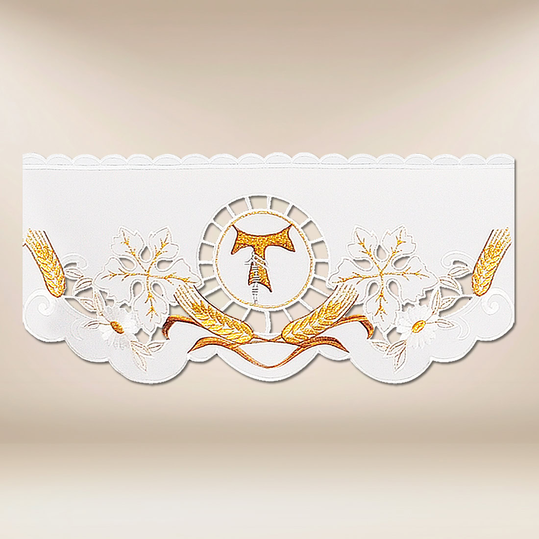 Koronka ołtarzowa haftowana „Franciszkańska” została opracowana jako symboliczne i estetyczne wykończenie obrusu ołtarzowego, inspirowane duchowością Zakonu Franciszkanów. Centralny motyw krzyża Tau – znaku pokory, zaufania i oddania Bogu – otoczony delikatnym haftem z motywami kłosów i roślin, tworzy harmonijną kompozycję sakralną. Symbolika ta doskonale współgra z liturgią, podkreślając szczególny charakter celebracji Eucharystii.