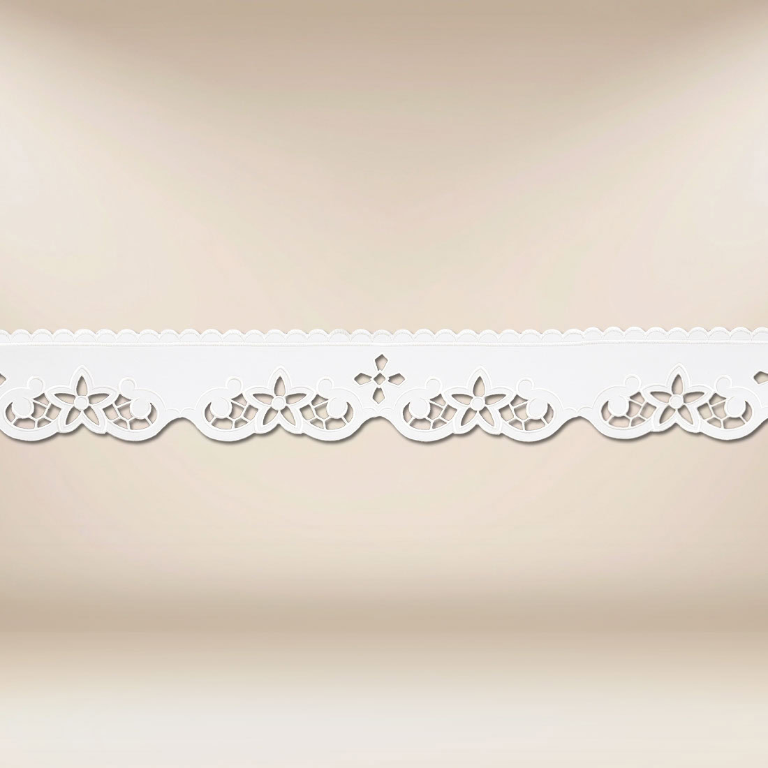 Prezentowana koronka haftowana liturgiczna „Florencki” została zaprojektowana jako subtelne wykończenie obrusu ołtarzowego, idealnie oddające sakralny klimat przestrzeni liturgicznej. Wzór florystyczny o delikatnym charakterze tworzy harmonijną linię, która nie dominuje, lecz elegancko uzupełnia wystrój ołtarza. Biała kolorystyka sprawia, że koronka doskonale prezentuje się zarówno w uroczystych, jak i codziennych celebracjach.